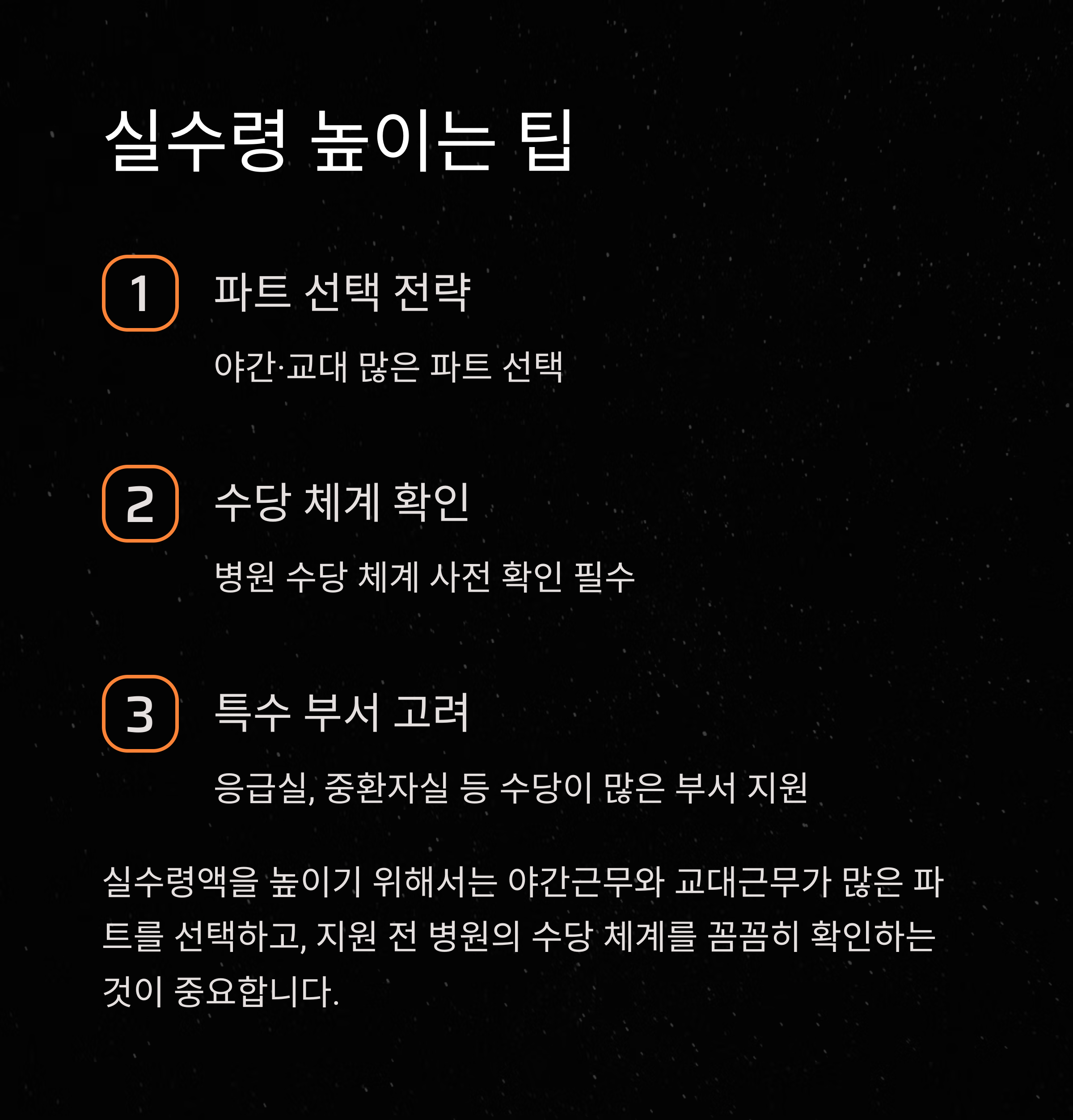 파트 선택이 월급에 직접 연결된다는 사실, 꼭 기억하셔야 합니다. 야간이 많고 힘든 부서일수록 수당이 많고, 그만큼 연봉도 빠르게 올라가요. 체력과 워라밸을 고려해 합리적인 선택을 하세요.