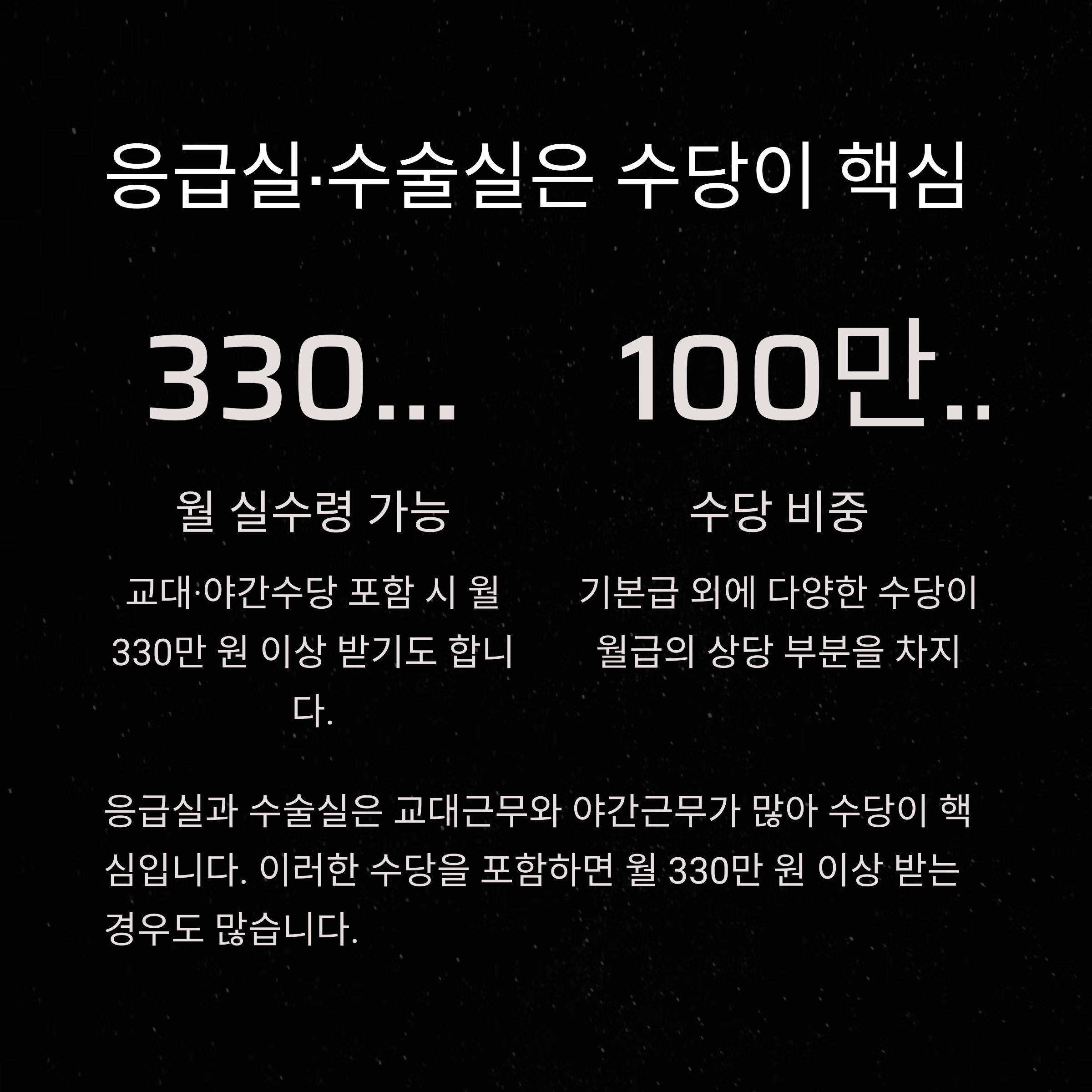 | 파트별 차이 | 수술실·응급실 > 병동 > 외래 순으로 월급 차이 큼 |