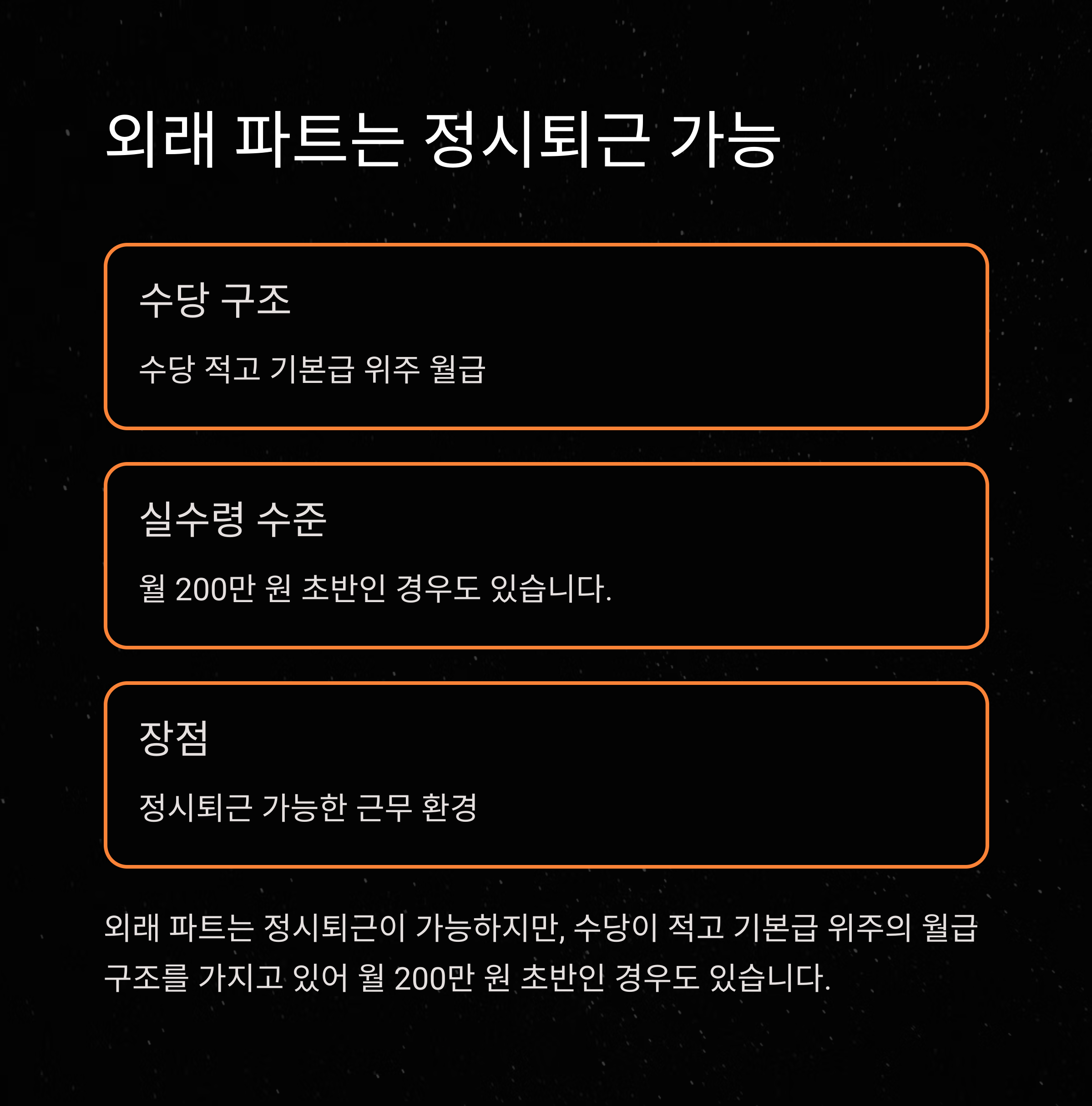 A. 네, 기본급은 낮지만 근무 시간이 짧고 인센티브 구조가 있는 경우가 많습니다.