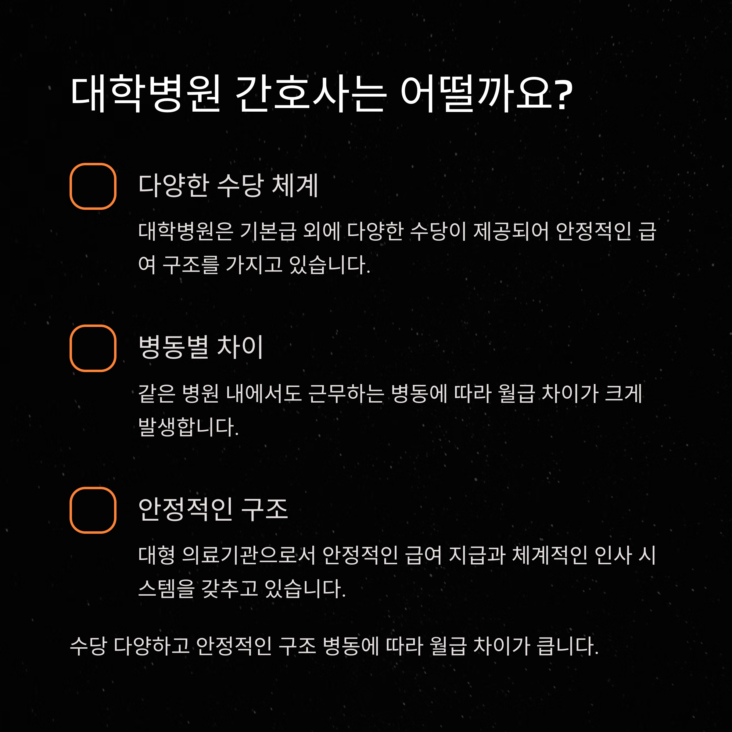 | 대학병원 | 월 270~310만 원, 수당 다양 |