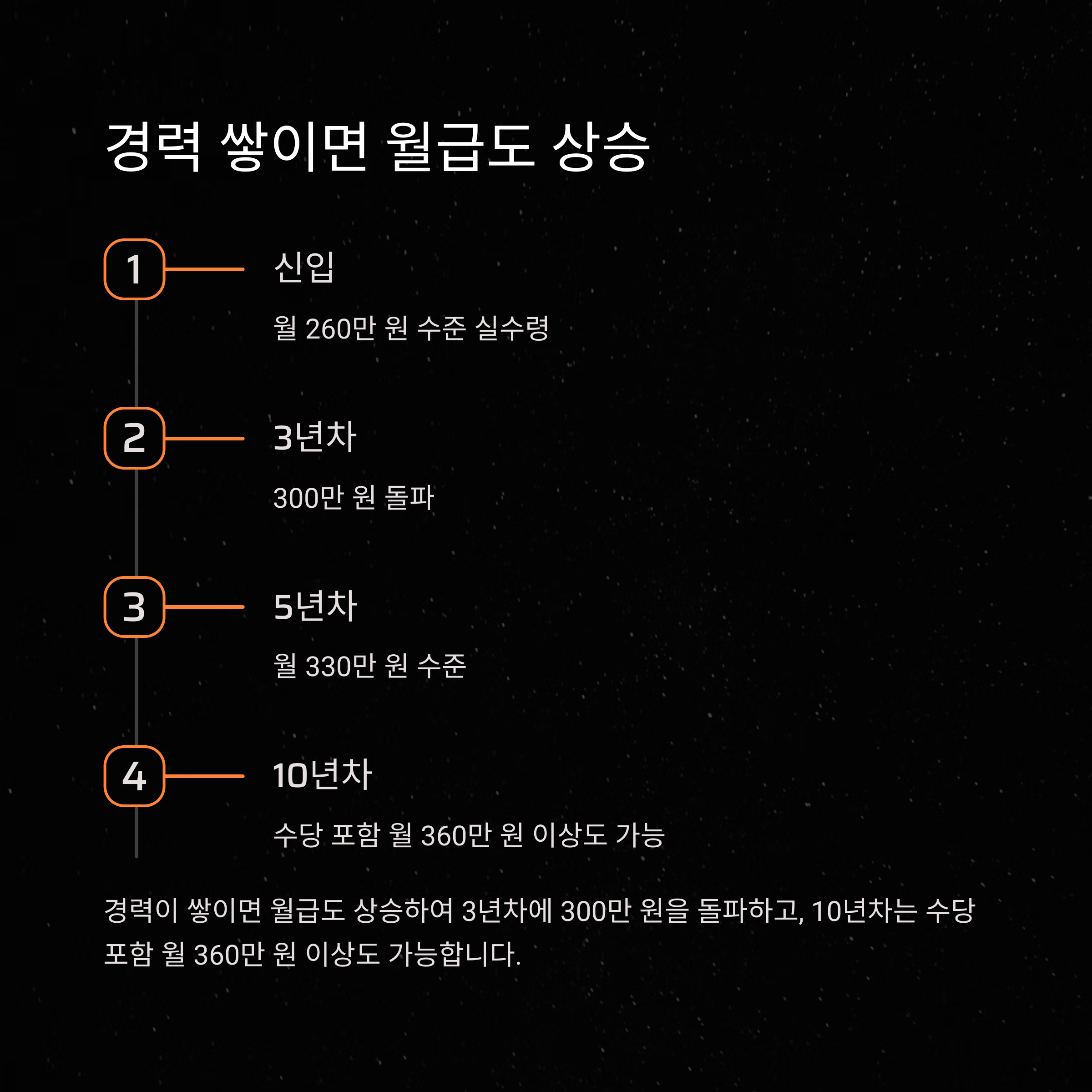제가 1년차였을 때 받던 실수령 월급은 260만 원 수준이었어요. 하지만 경력이 3년, 5년, 10년차로 갈수록 기본급이 눈에 띄게 올라서 5년차 기준으로는 310만 원, 10년차는 360만 원까지 올라갔습니다. 특히 병원 내부 직급 승진이 되면서 수당이 붙으면 월 400만 원 이상도 가능합니다.