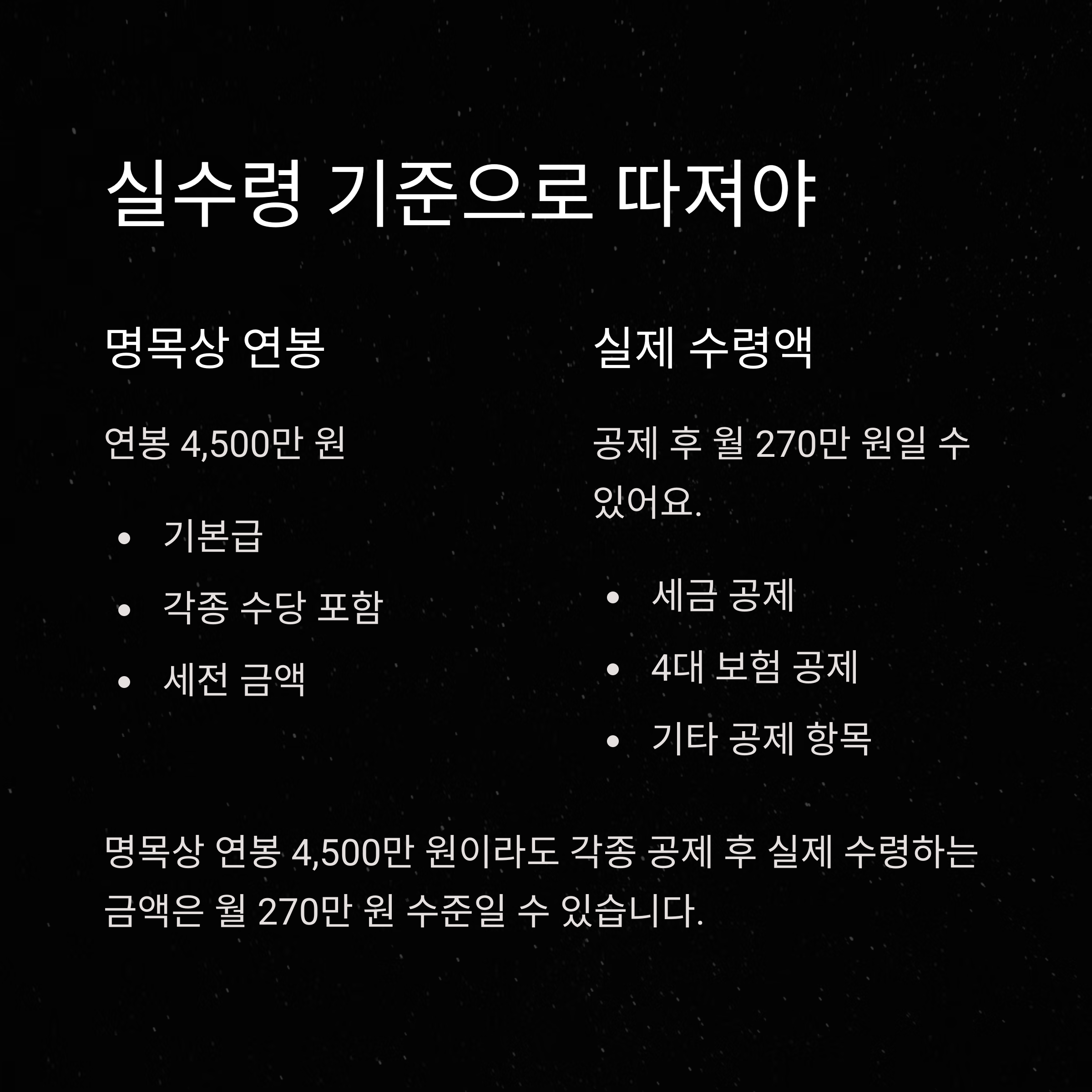 제가 추천드리는 방법은 면접 볼 때 수당 항목을 직접 물어보고, 최근 입사자의 실수령을 문의하는 거예요. 공시 연봉만 믿고 입사했다가 실망하는 경우를 정말 많이 봤습니다.