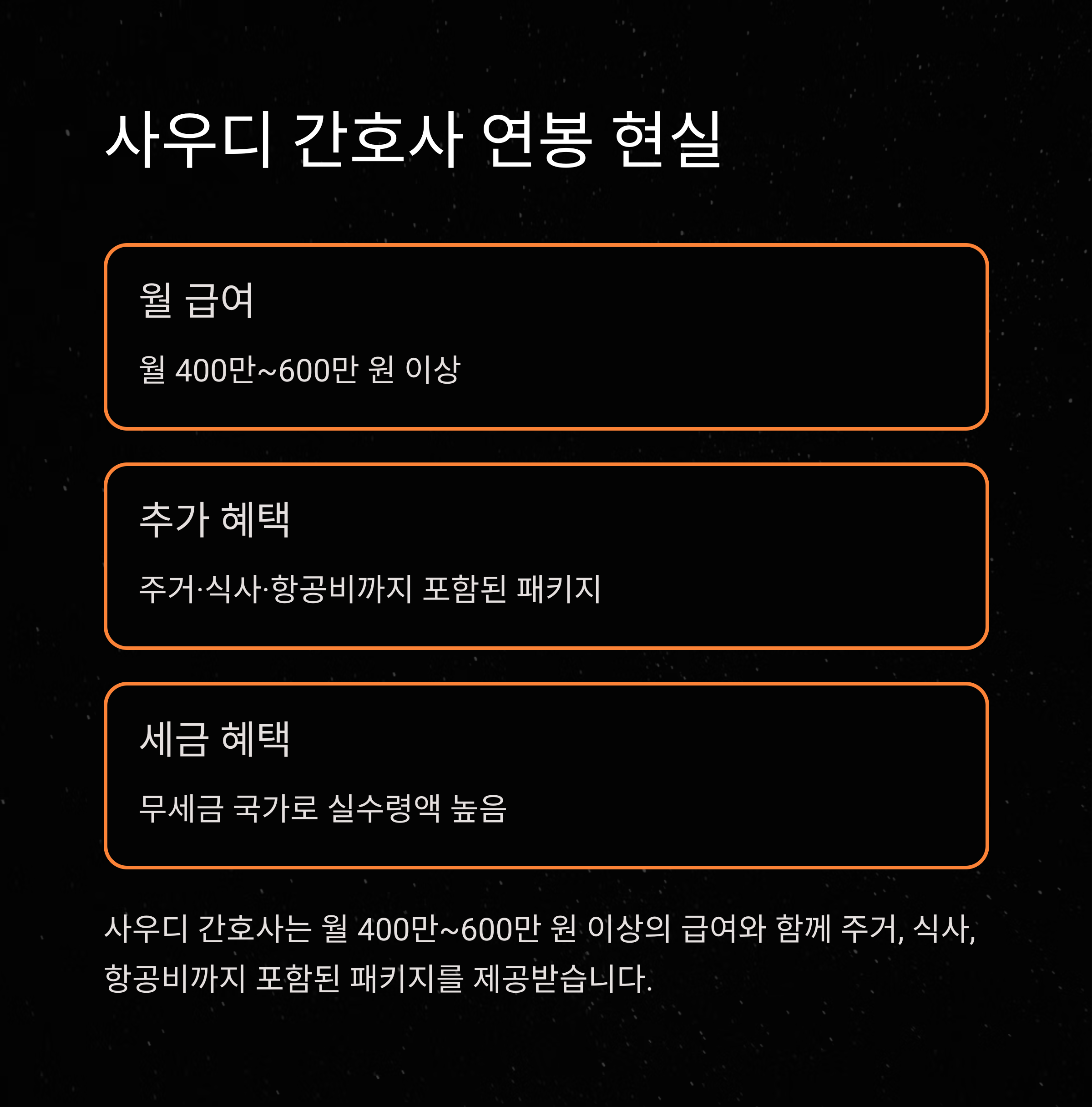 제가 사우디 간호사 파견 정보를 알아보던 당시, 가장 놀라웠던 건 월급 수준이 한국보다 확연히 높았다는 점이었어요. 특히 경력자 기준으로는 월 400만 원에서 600만 원까지 제시받는 경우가 있었고, 주거·항공·식사 지원이 모두 포함되어 실수령 개념 자체가 다르더라고요.