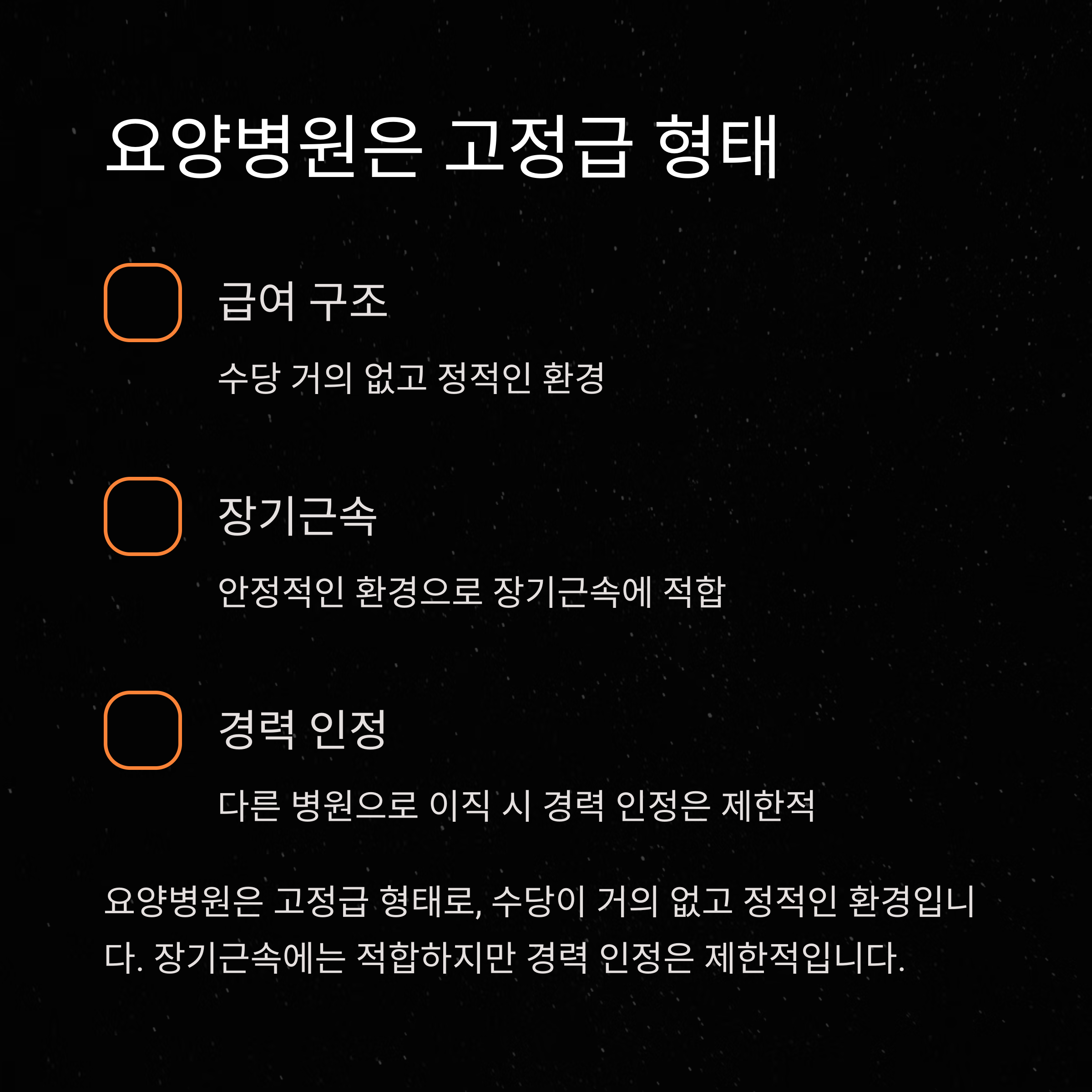 제가 느낀 요양병원의 장점은 '오래 일하기 좋은 환경'이었고, 단점은 '경력 인정 폭이 작다'는 점이었습니다. 이직할 때는 반드시 '요양병원 경력 인정 여부'를 확인하시길 권해드려요.