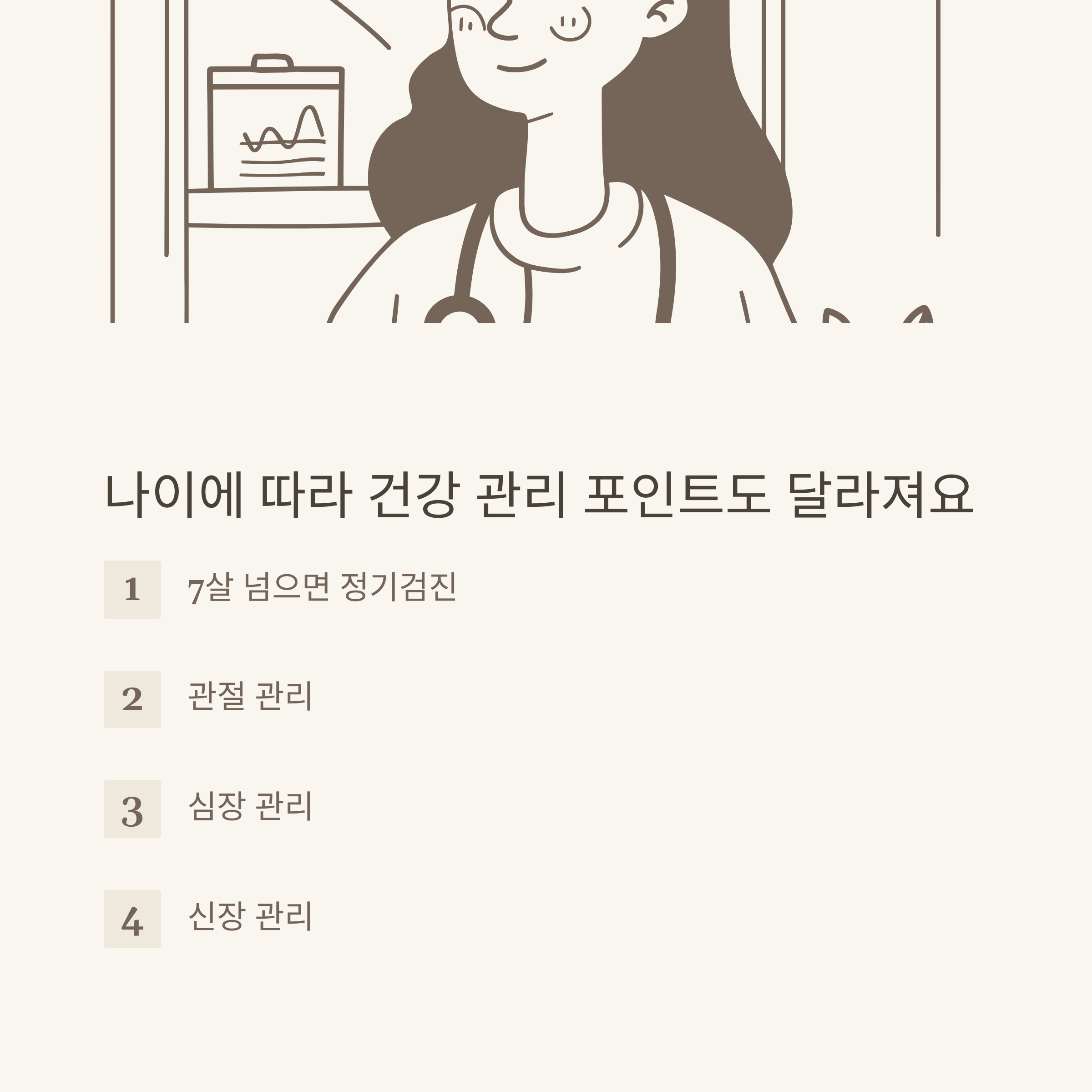A. 만성질환, 비만, 관절·심장·신장 질환에 주의하며 영양·운동도 신경써야 합니다.