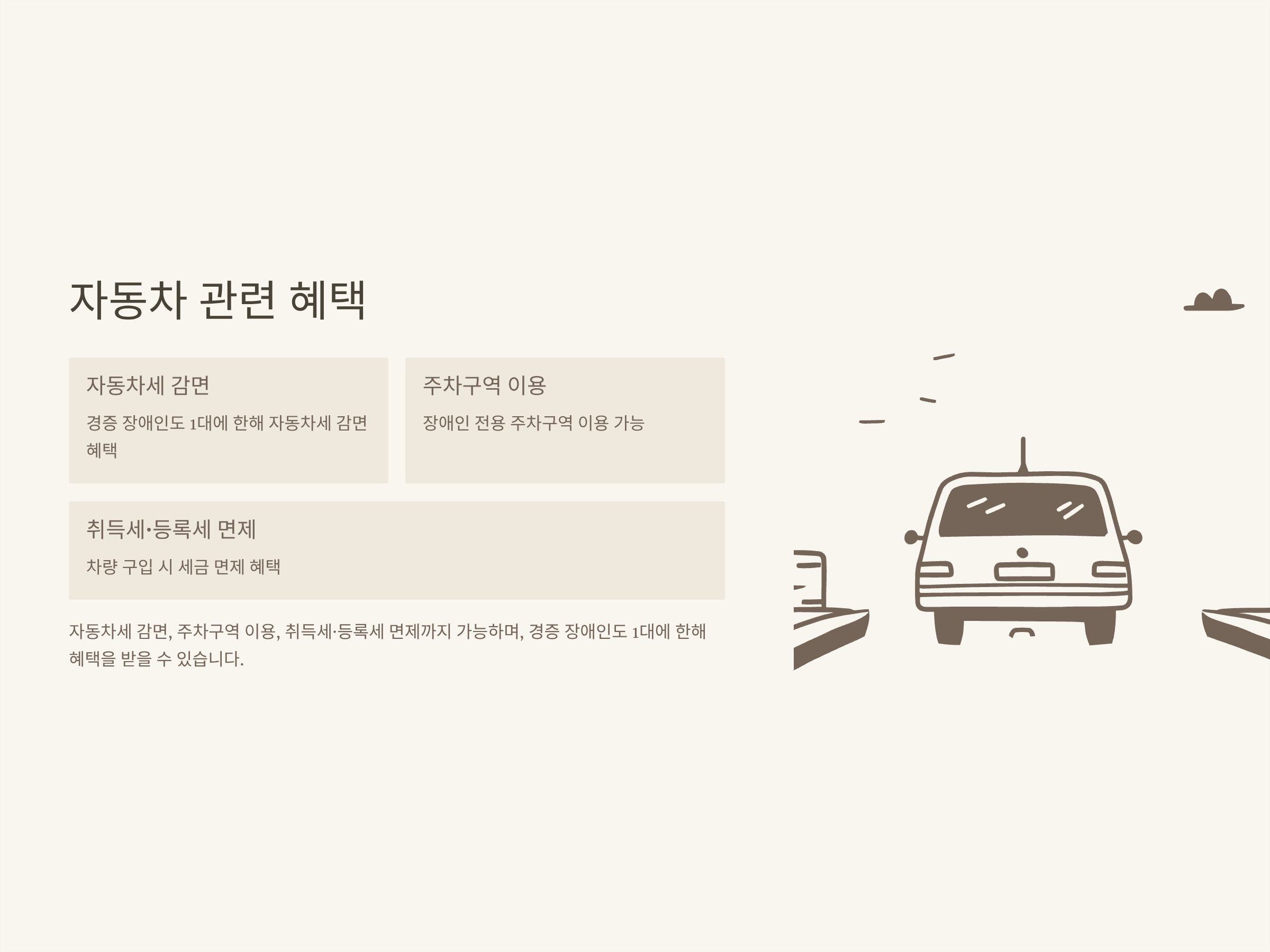 저는 운전이 생활의 일부라 자동차 관련 혜택도 꼼꼼히 따져봤습니다. “경증 장애인은 자동차 혜택이 거의 없지 않을까?”라는 오해가 있는데, 실제로는 자동차세 감면, 취득세 면제, 장애인 전용 주차구역, 고속도로/공영주차장 할인 등 실질적인 지원이 많았습니다.