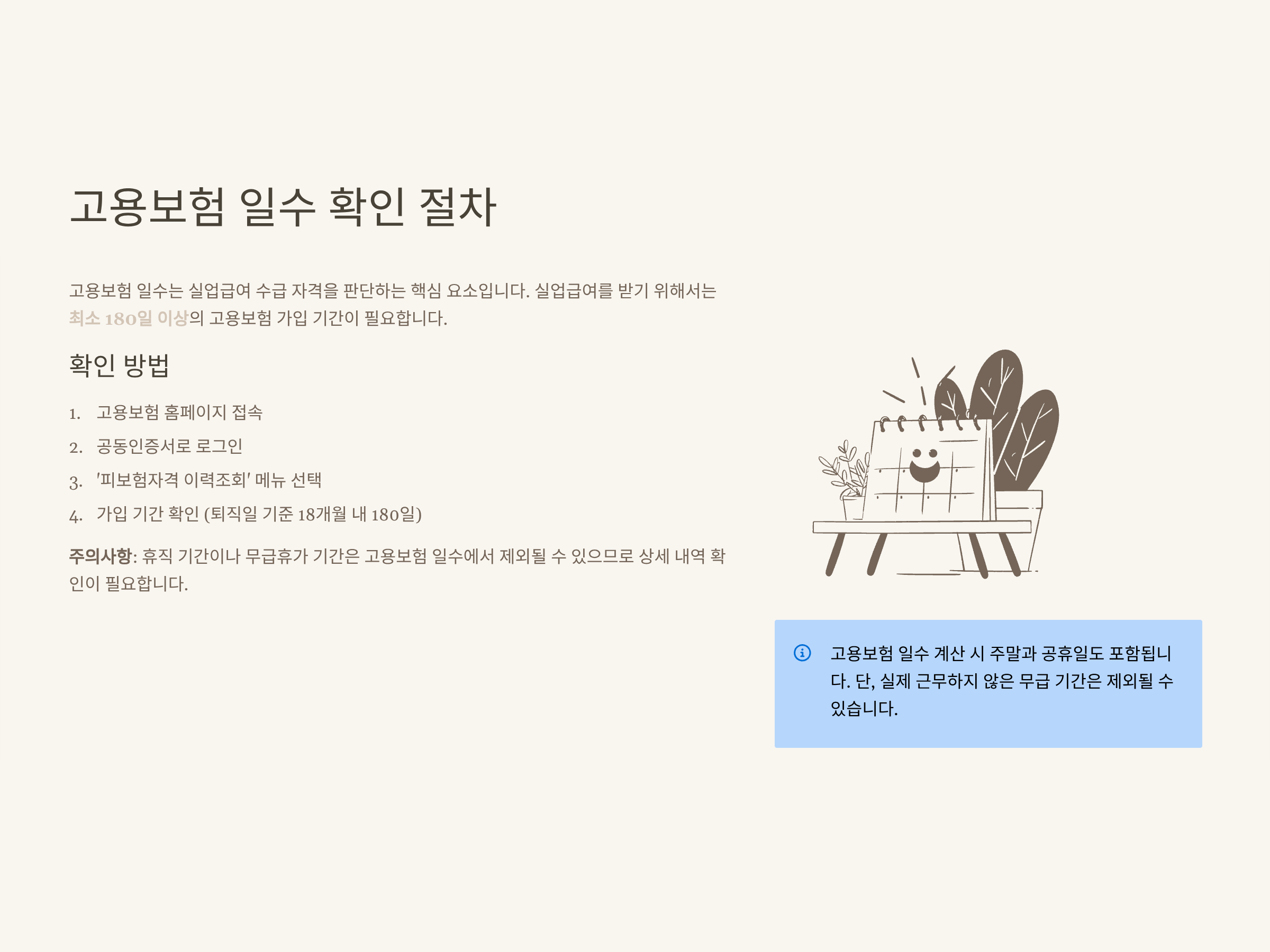 고용보험 일수 확인은 실업급여 수급 자격을 판단하는 핵심 요소입니다. 저는 이직이 많았던 시기에 일수 계산이 복잡해 직접 합산해본 적이 있는데, 예상보다 실제 일수가 적게 나와 놀랐던 기억이 있습니다. 일수 확인은 고용보험 홈페이지 ‘피보험자격 이력조회’ 메뉴에서 가능하며, 각 근무 기간별 보험 가입일을 합산해 총 가입 일수를 계산합니다. 실업급여를 받기 위해서는 최소 180일 이상의 피보험단위기간이 필요합니다. 주의할 점은, 휴직 기간이나 무급휴가 기간은 일수에서 제외될 수 있으니 반드시 상세 내역을 확인해야 합니다. 필요한 경우 근로복지공단을 통해 공식 확인서를 발급받으면 정확한 일수를 확인할 수 있습니다.