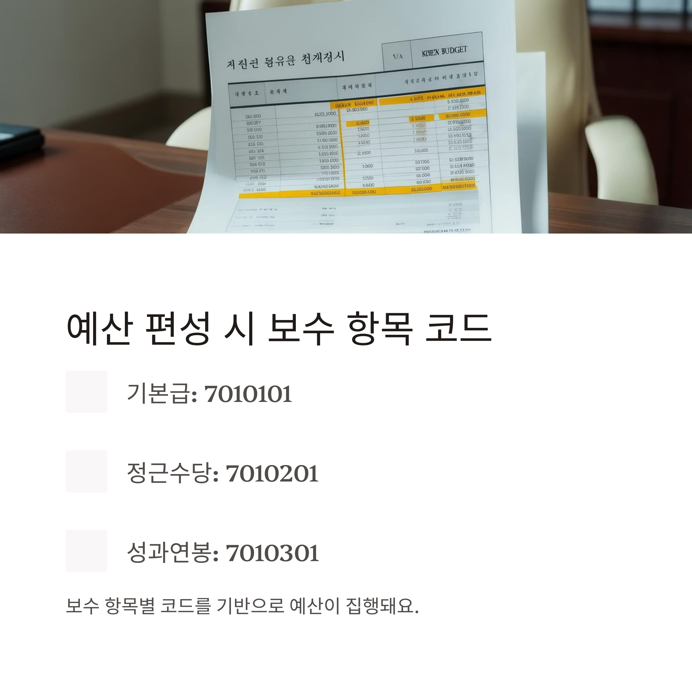제가 부서 예산업무를 맡았을 때 가장 먼저 배운 것은 보수항목 코드였습니다. 공무원 보수는 단순히 금액만 따지는 것이 아니라, 행정정보공개 시스템과 연결되는 코드 기반으로 예산 편성이 이뤄지기 때문에 정확한 항목 코드 숙지가 필수입니다.
