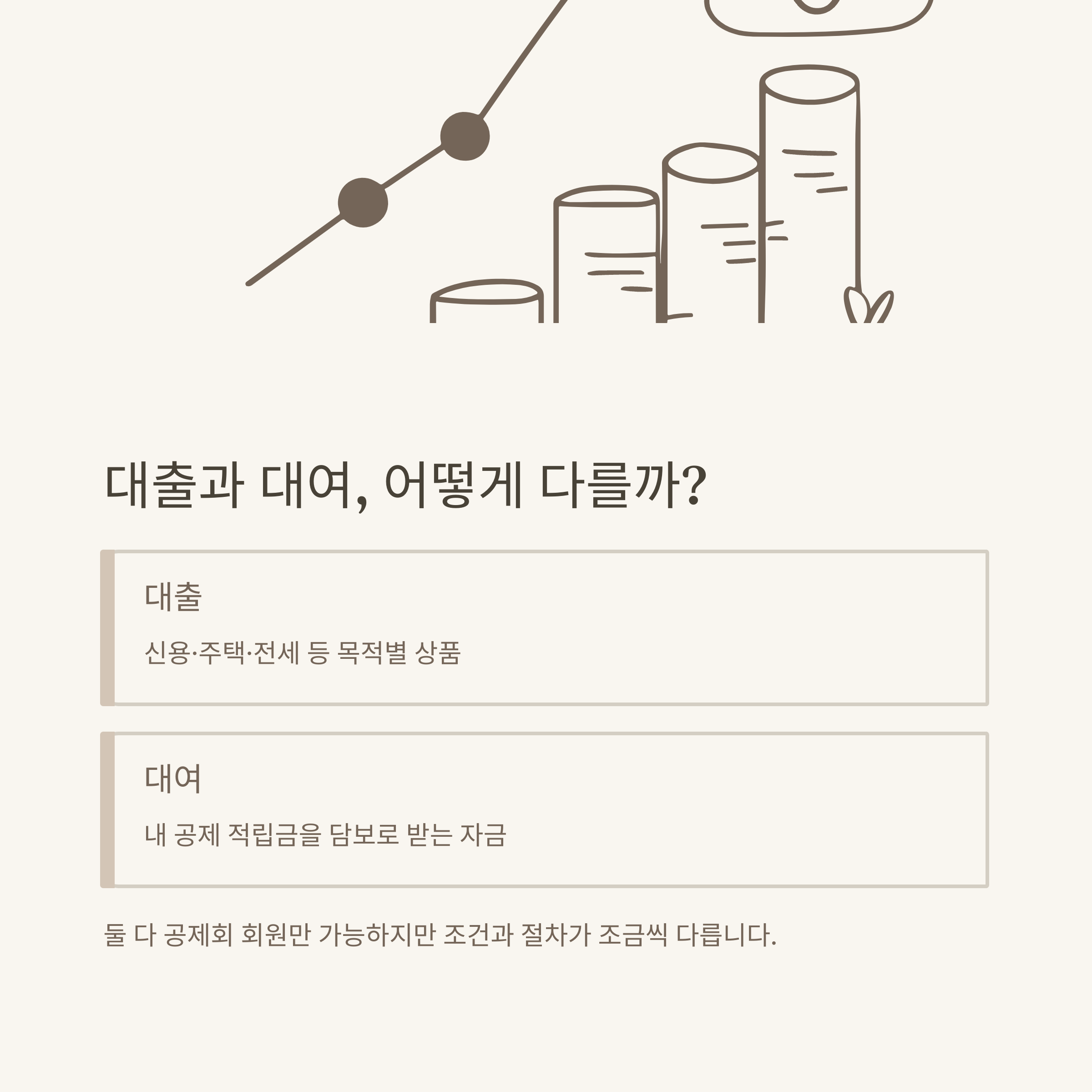 공제회 대출과 대여의 차이를 헷갈리는 분들이 많더라고요. 실제로는 대출(신용, 주택, 전세 등)과 대여(공제회 적립금 담보)가 별도 운영됩니다.