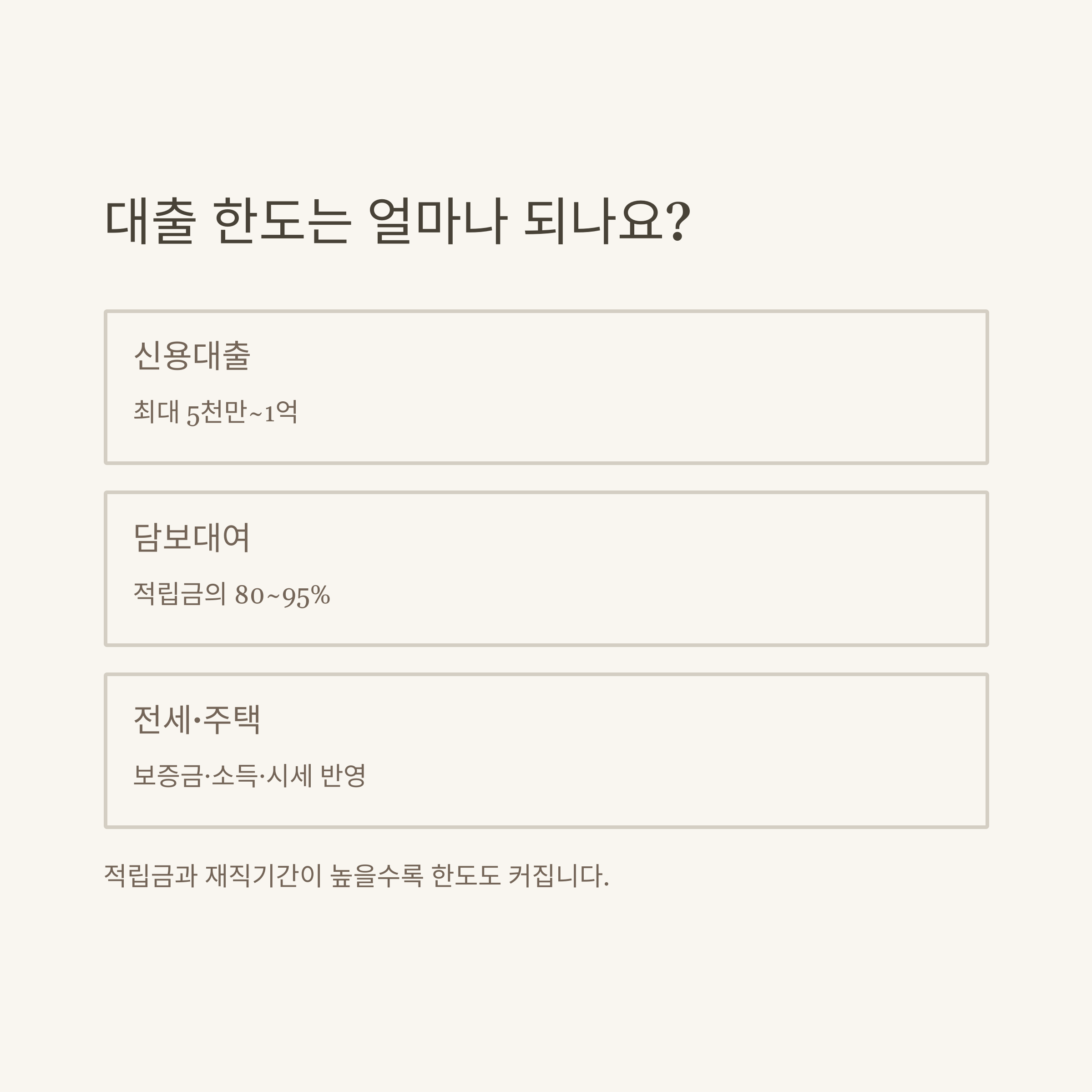 - 공제금 담보대여: 본인 적립금의 80~95%까지