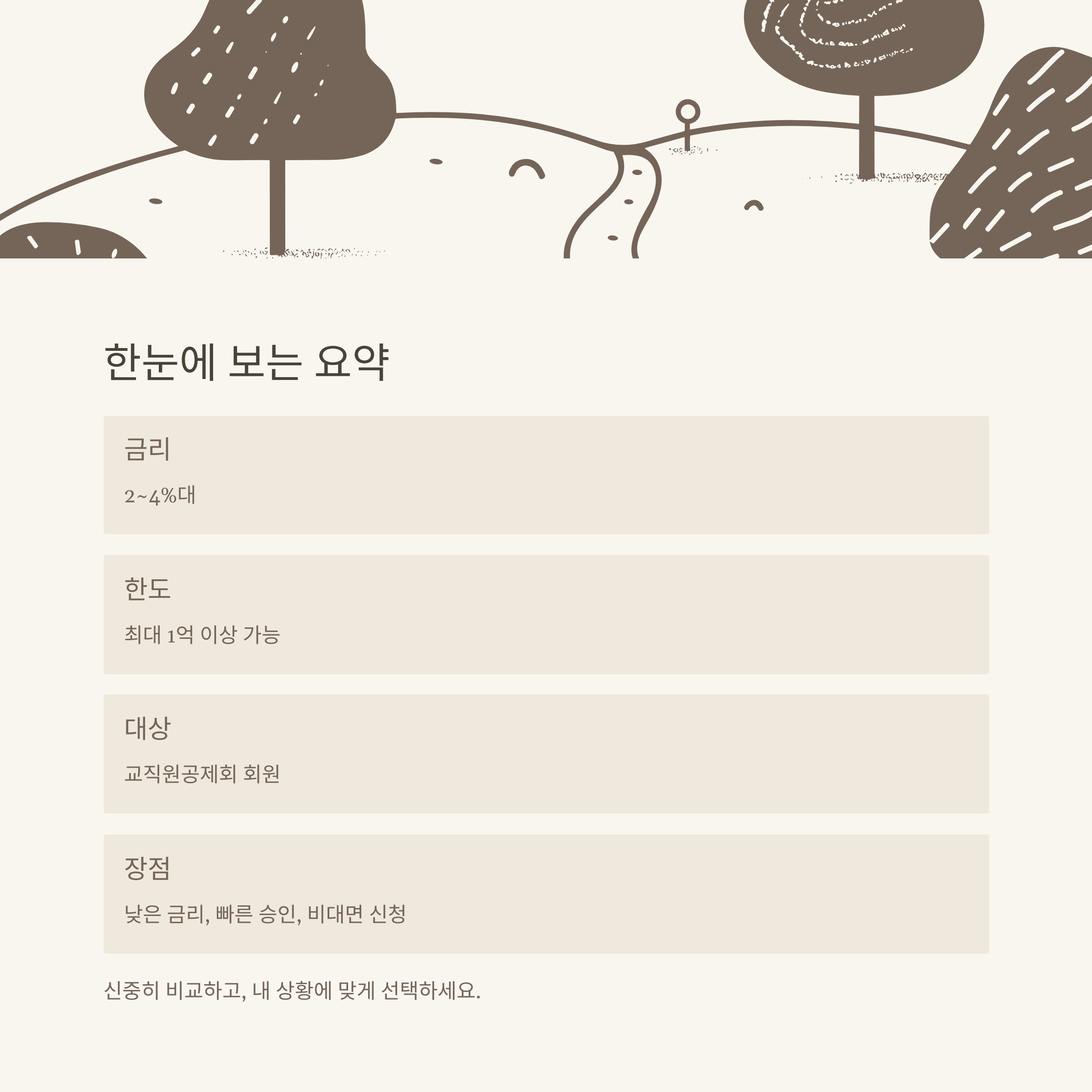 A. 교직원공제회 회원 자격을 갖춘 교직원 또는 퇴직 회원이 신청 가능합니다. 세부 자격은 공식 안내에서 확인하세요. - Q2. 대출 금리와 한도는 어떻게 결정되나요?