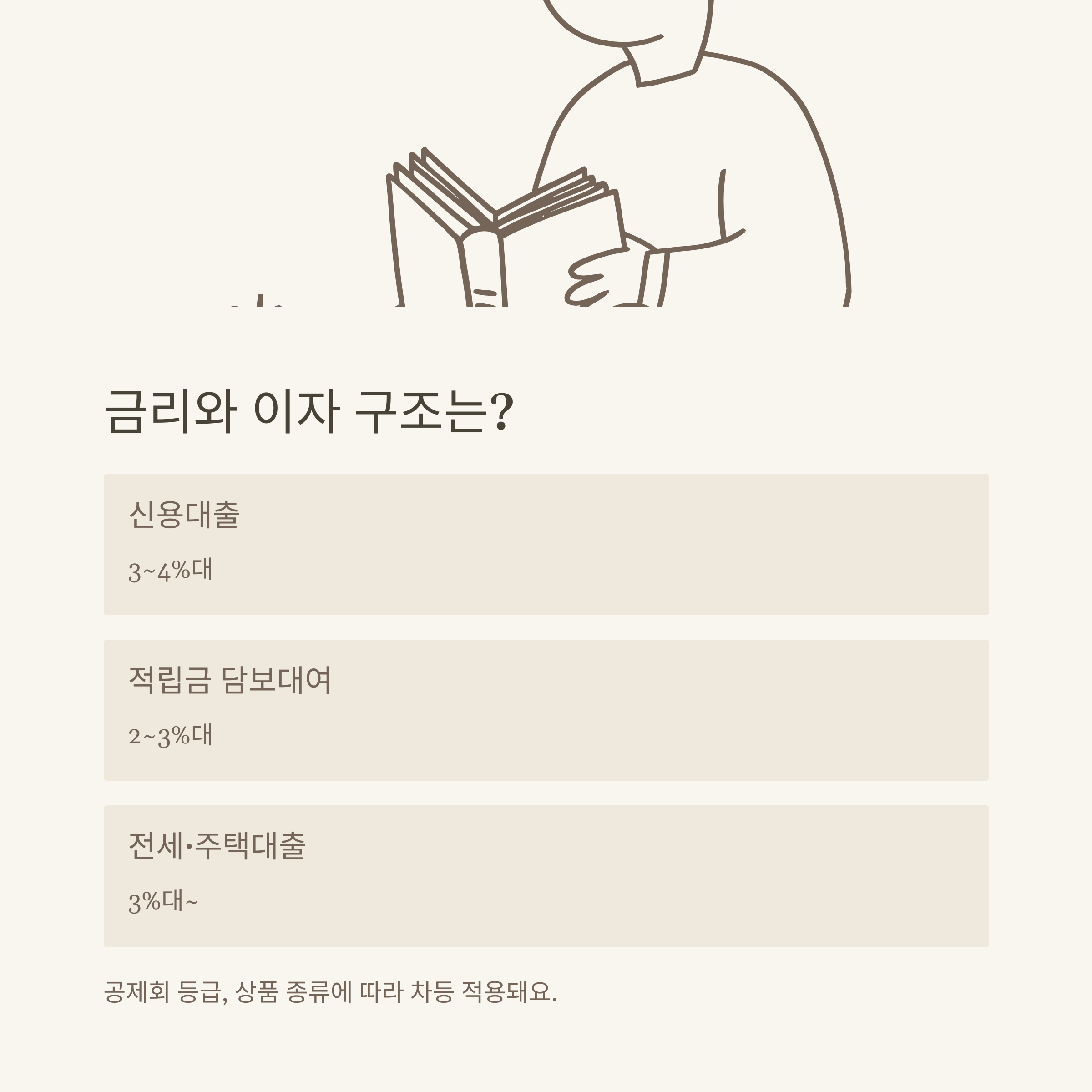 신용대출 | 생활안정·일반 | 3~4%대 | 5,000만~1억 | 심사 간소, 등급별 한도 차등 | 상품 안내 |