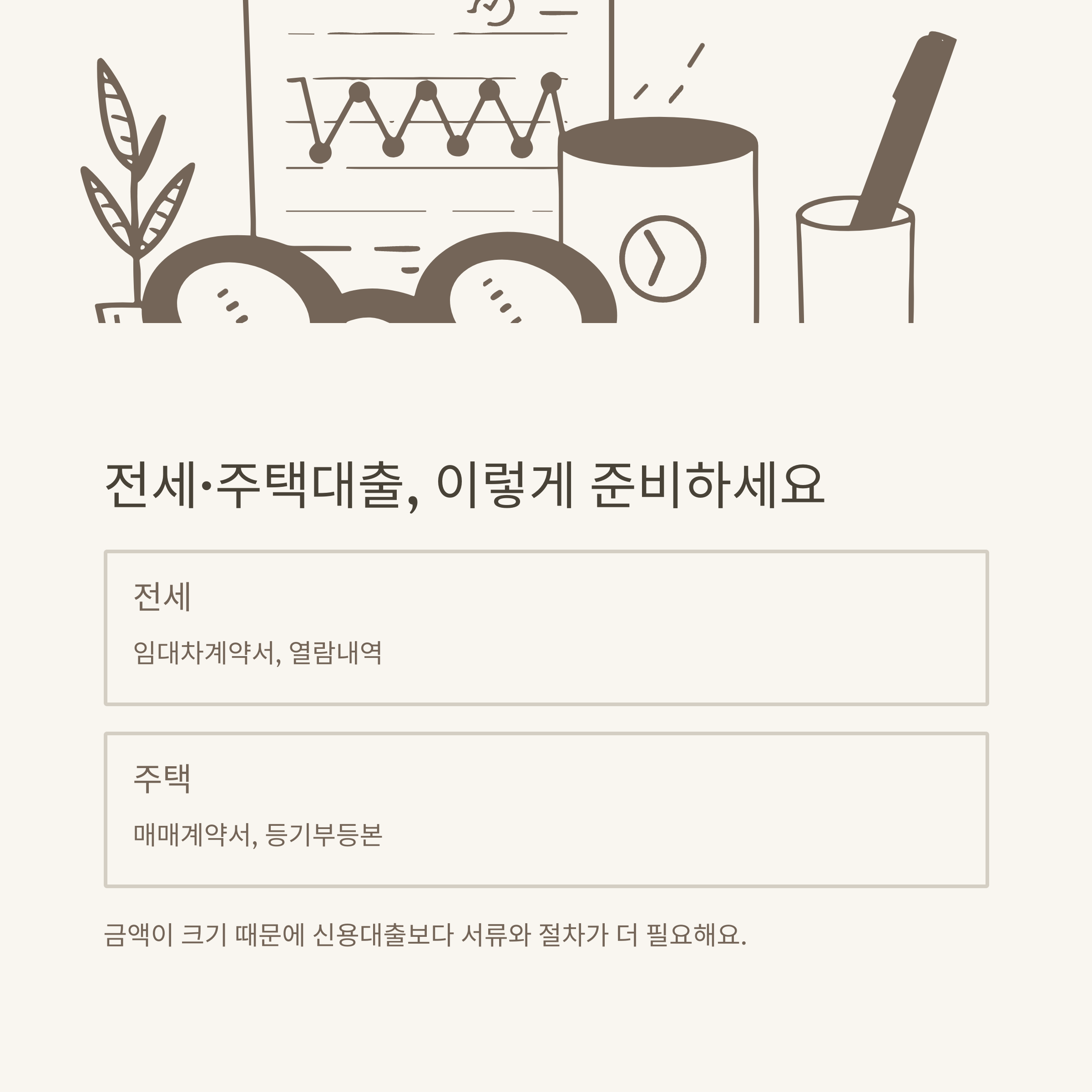 - 주택·전세대출: 부동산 계약서, 등기부등본 등 필수