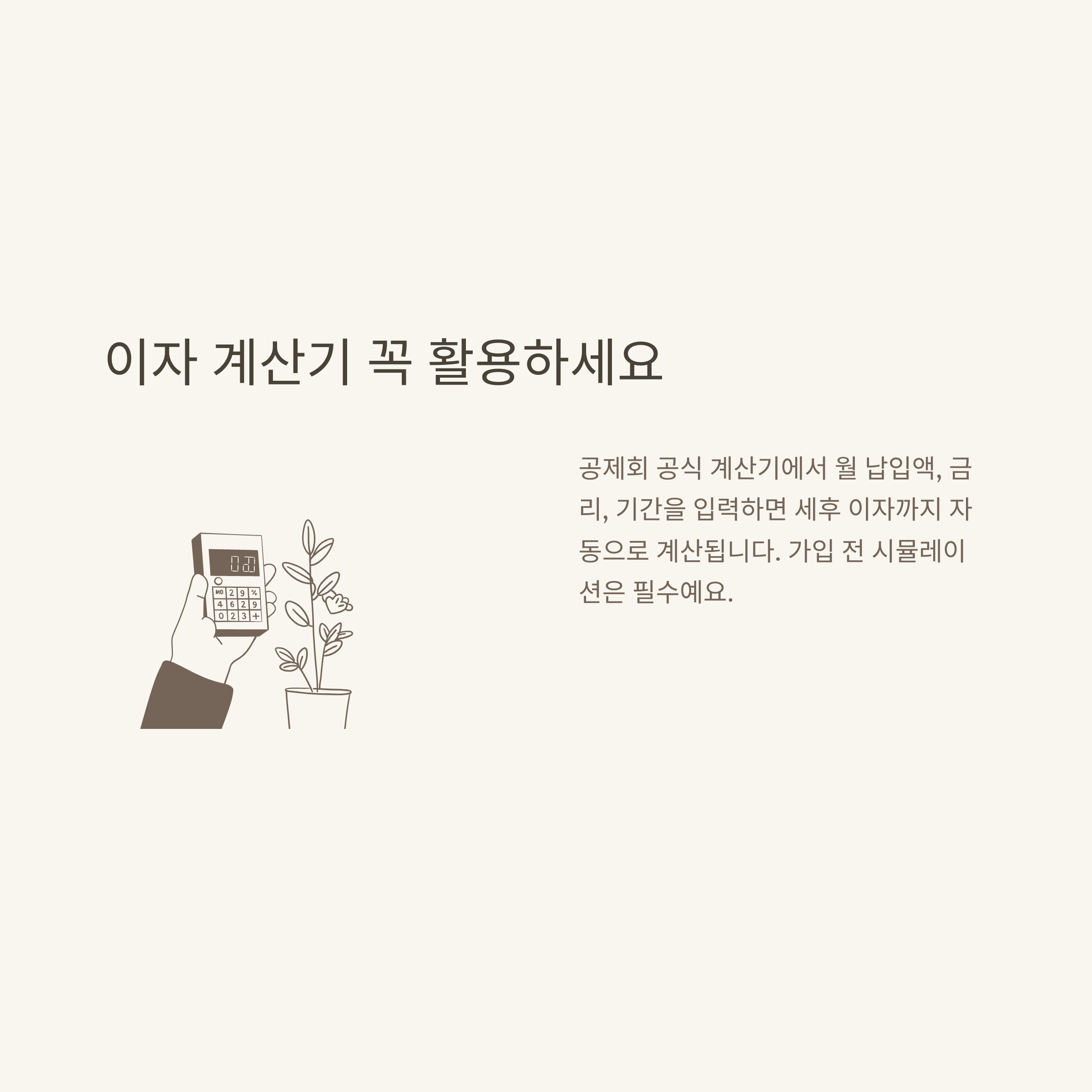 계산기는 모바일에서도 지원되고, 실제 예상 수령액과 이자를 비교해보고 최적의 금액·기간을 결정할 수 있습니다. 저는 가입 전 항상 공제회 적금 계산기로 시뮬레이션을 해보고 결정했습니다.