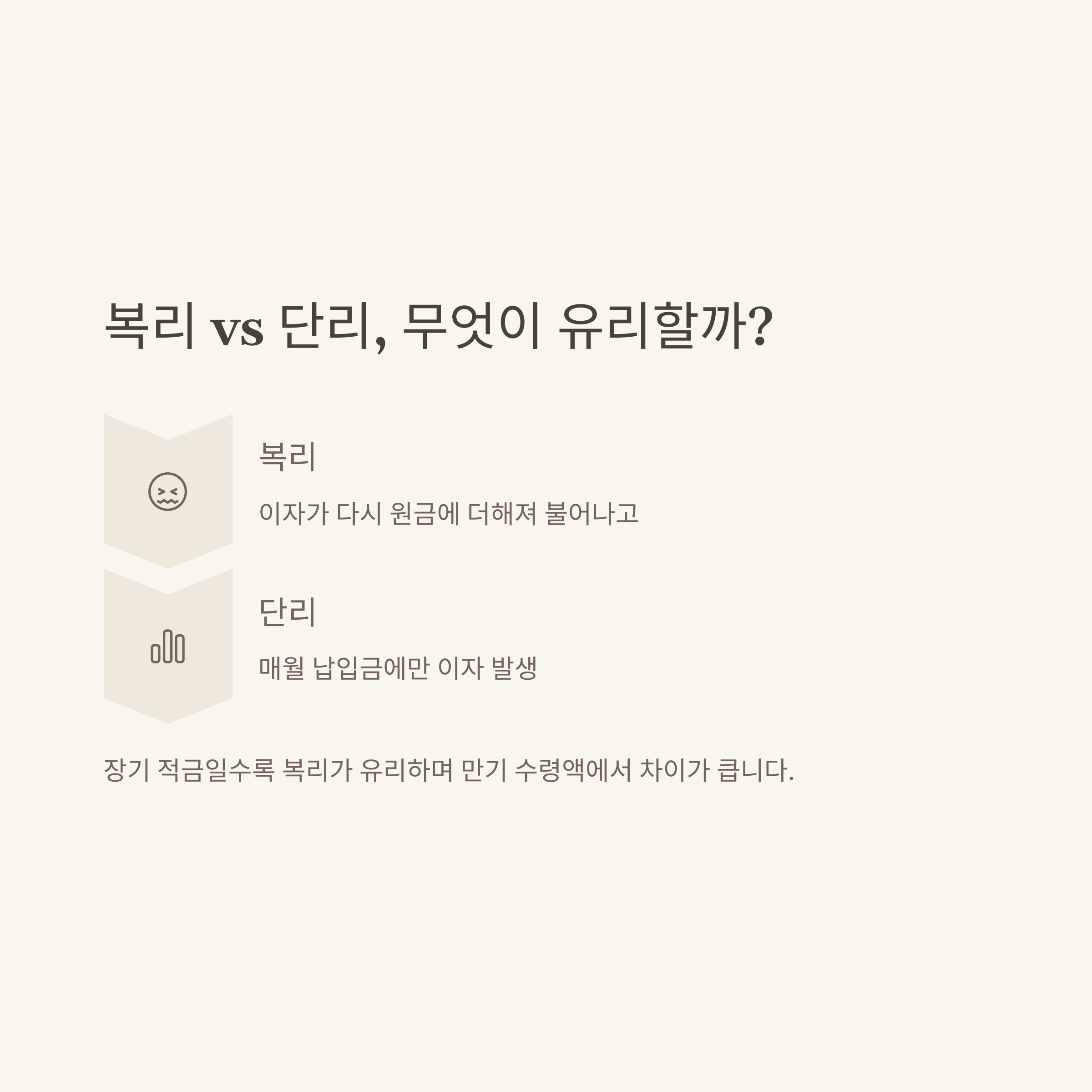 복리의 경우 이자가 원금에 합산되어 재이자를 받기 때문에, 장기로 갈수록 이자 차이가 커집니다. 단리라면 매월 납입금에만 단순히 이자가 붙는 구조라 계산이 단순하죠.