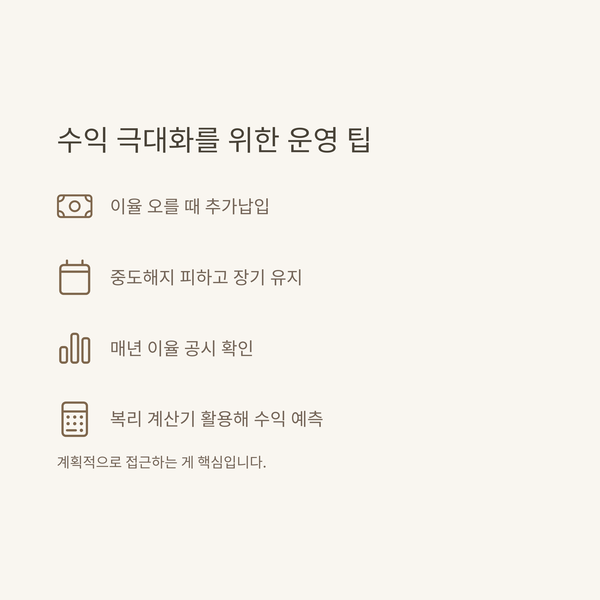 A. 장기 유지, 추가납입 타이밍 조절, 중도해지 최소화가 핵심입니다. 매년 공시이율을 체크하고, 공식 계산기로 미리 시뮬레이션해보세요.