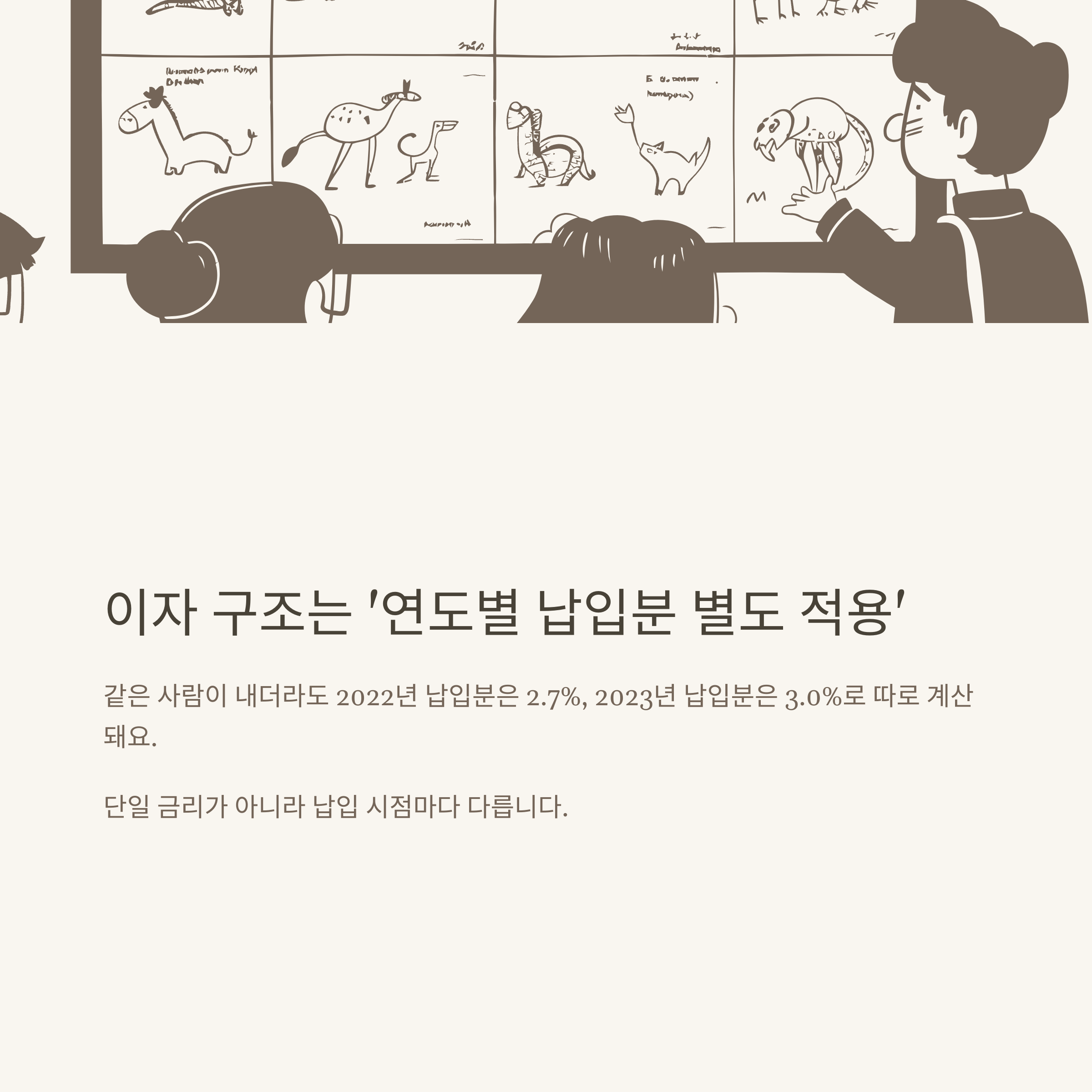 예를 들어, 2022년에 2.7% 이율로 납입한 금액은 만기까지 그 금리로 적용되고, 2023년에 추가 납입한 금액은 2023년 공시이율로 적용됩니다. 즉, 적립금 전체가 단일 금리로 운용되는 것이 아니라 “연도별, 납입분별”로 각각의 이율이 쌓이는 구조라 이자 계산이 조금 복잡해질 수 있습니다.
