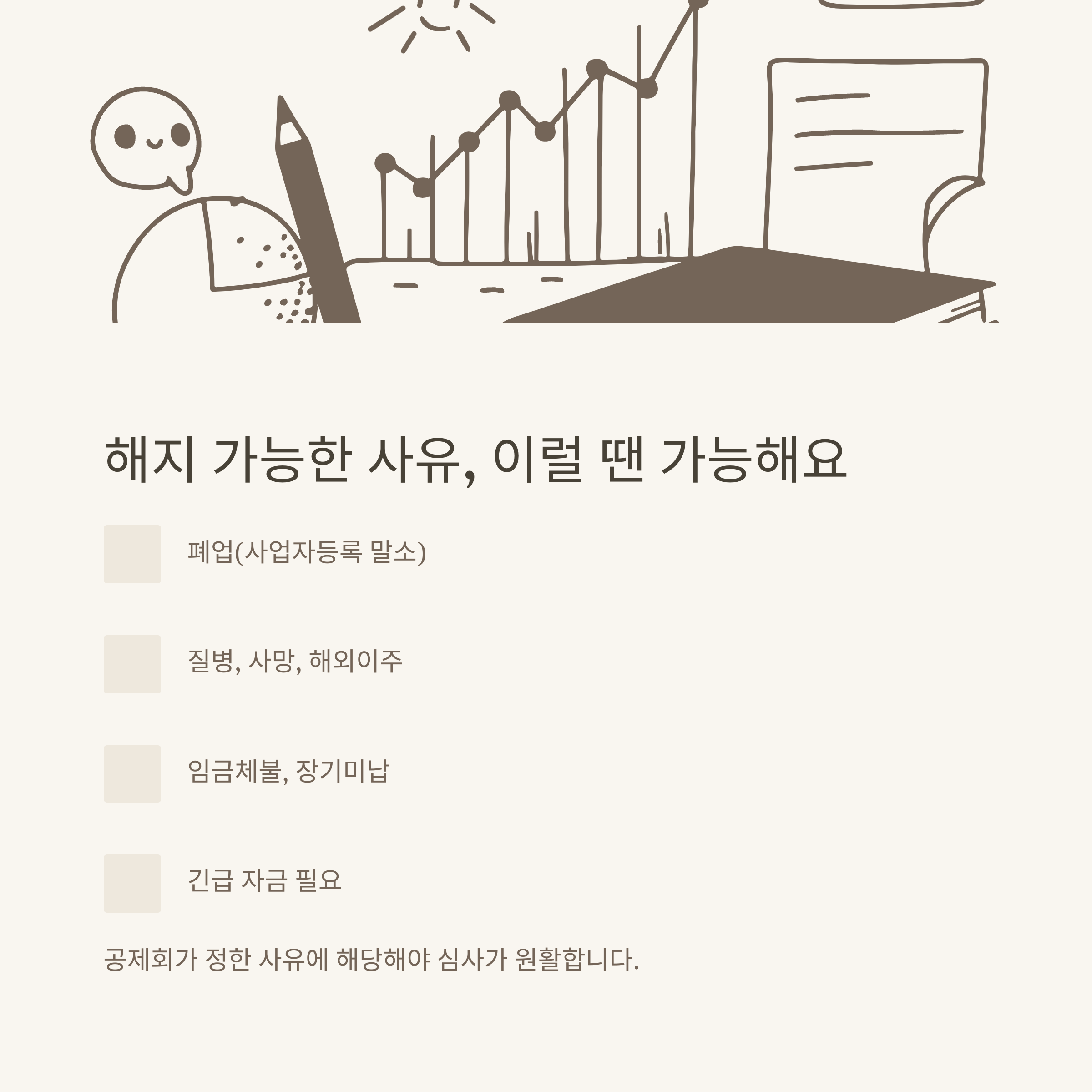 - 정상해지: 폐업, 사망, 질병, 70세, 해외이주 등