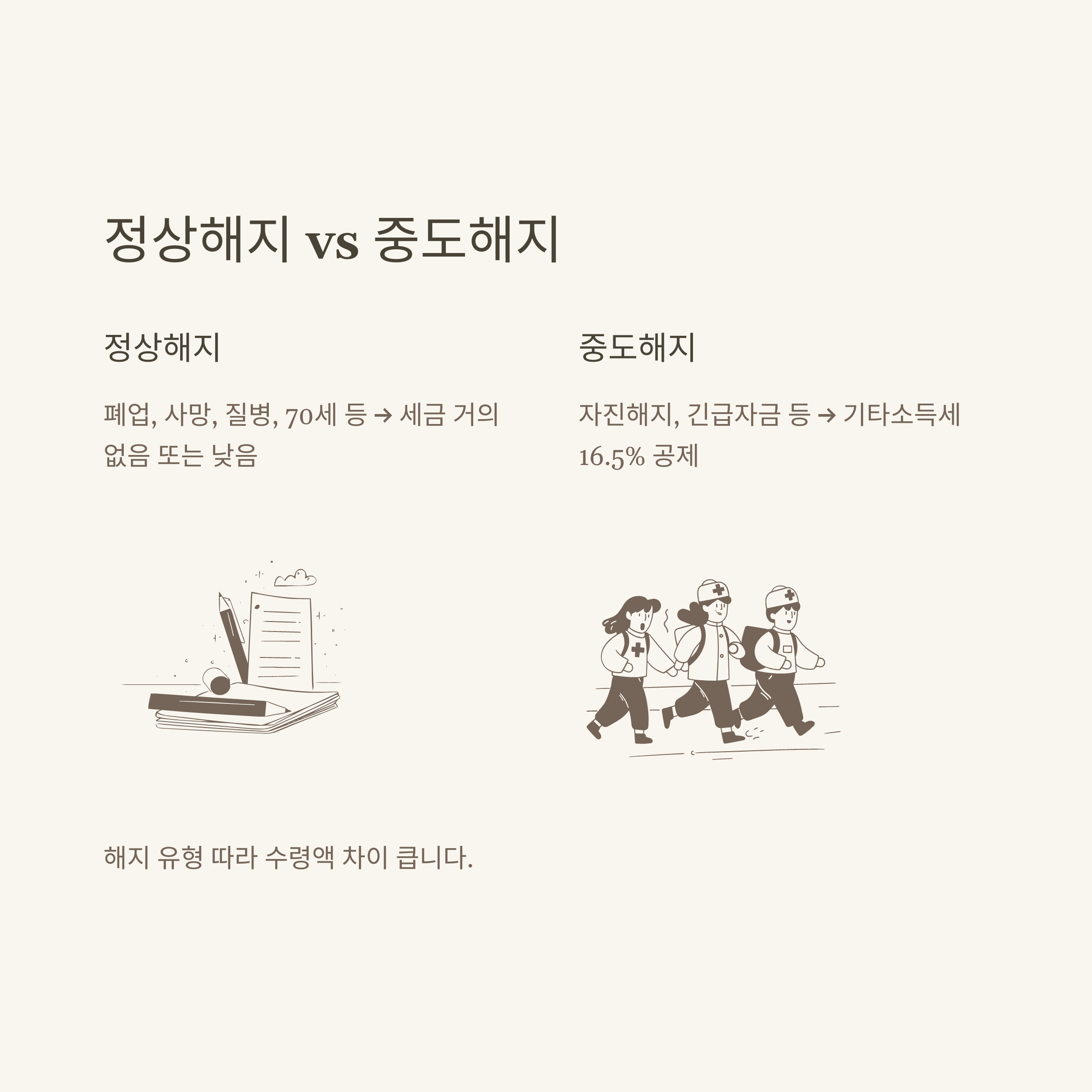 해지는 크게 정상해지(폐업·사망 등)와 중도해지(자진 해지, 긴급자금 등)로 나뉘며, 정상해지는 대부분 비과세 또는 저율 과세가 적용되고, 중도해지는 기타소득세율(16.5%) 등 불이익이 있습니다.