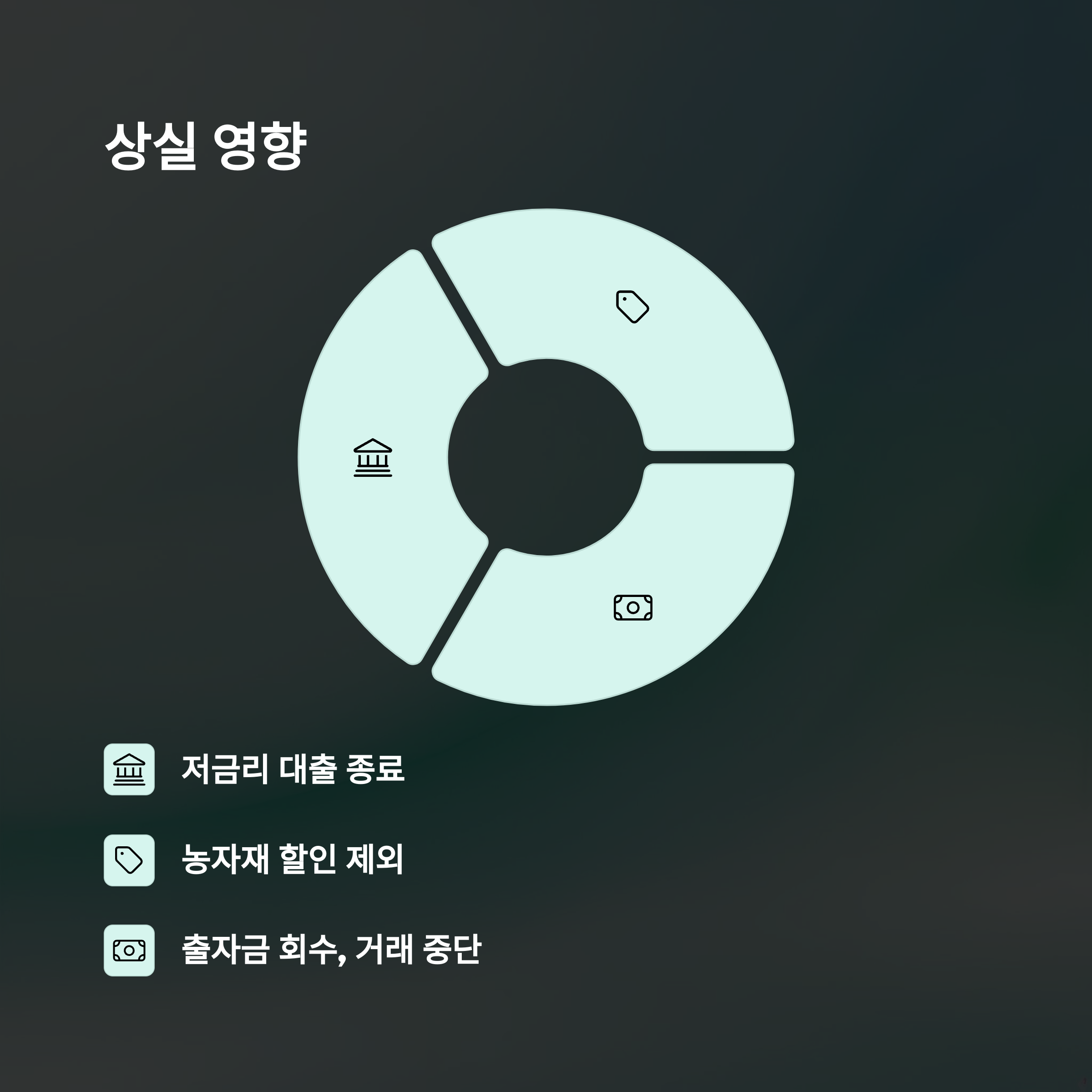 조합원 자격을 상실하게 되면 생각보다 타격이 큽니다. 저는 예전에 이웃 농가분이 자격 박탈을 당하는 걸 지켜봤는데, 조합원 대출 이자율이 일반으로 바뀌면서 갑자기 부담이 커졌다고 하더라고요. 농자재 구입 시 조합원가 적용이 안 되는 것도 큰 불편이라고 했습니다.