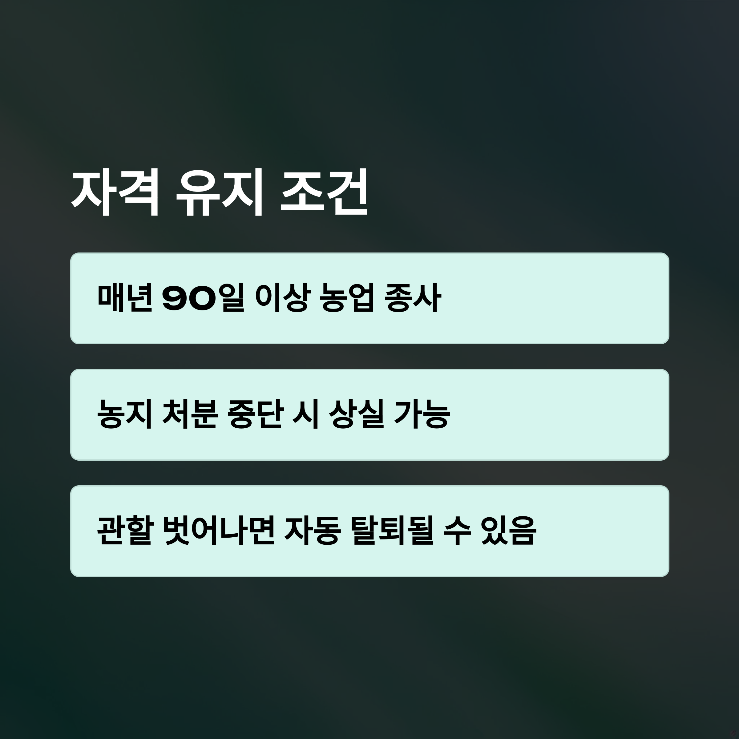 - 자격 취득 후에도 매년 농업 활동 90일 이상 유지 필수