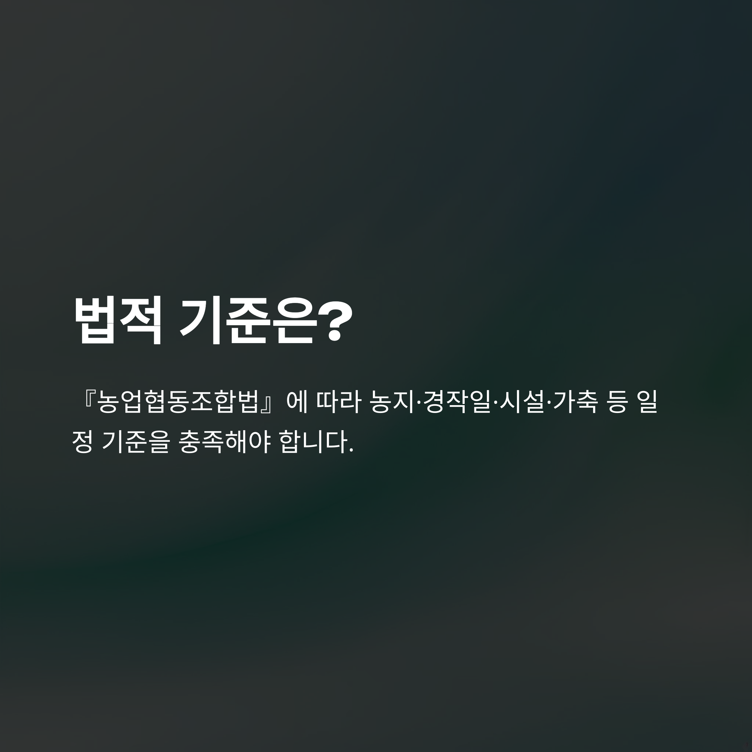 | 조합원 자격 조건 | 농지 1,000㎡ 이상 또는 90일 이상 농업 종사 |
