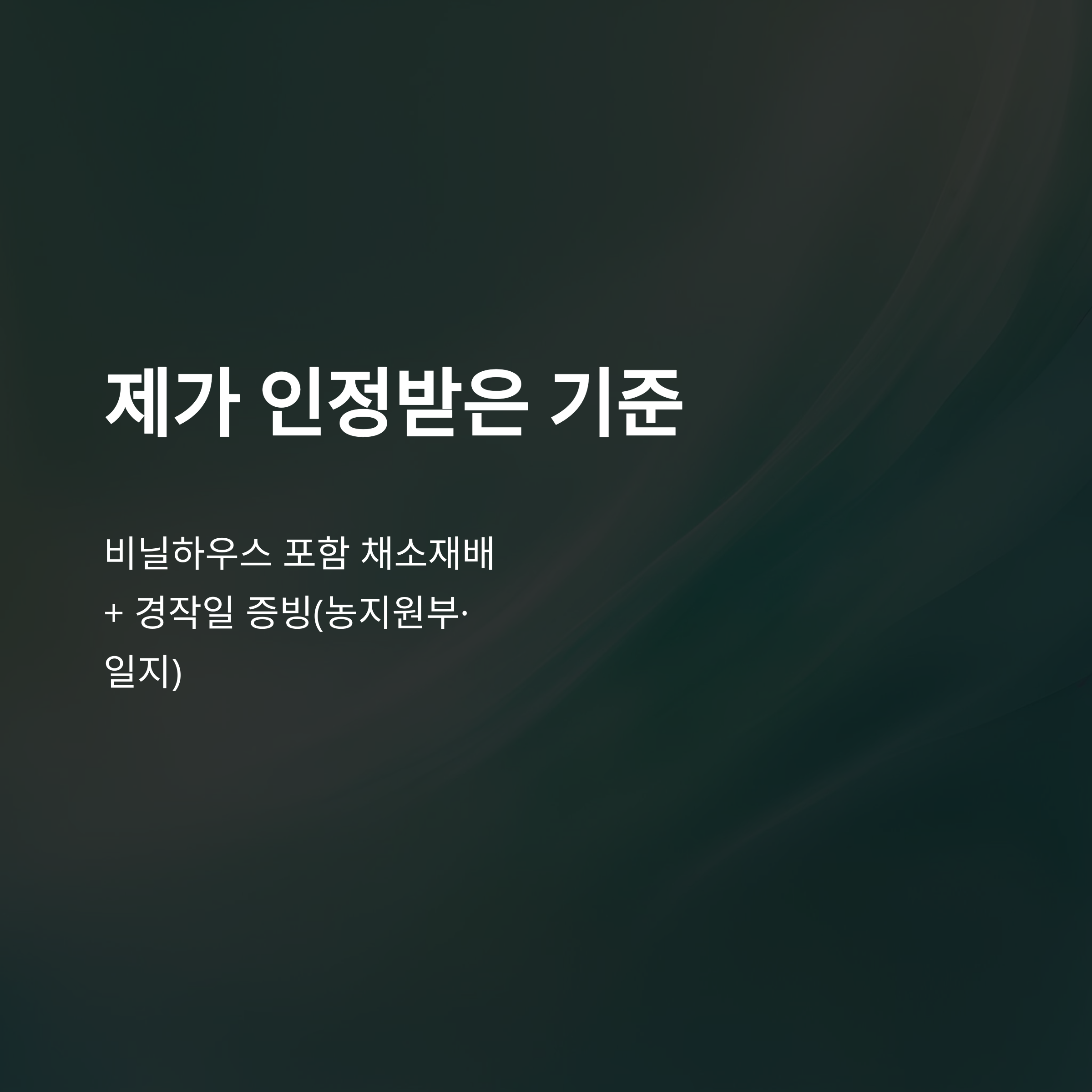 실제로 저는 비닐하우스를 갖추고 채소 재배를 했기 때문에, 이 기준으로 자격이 인정됐습니다. 특히 ‘연간 90일 이상 종사’는 꼭 농지원부나 실제 근무일지로 입증해야 하므로 미리 준비하셔야 합니다.