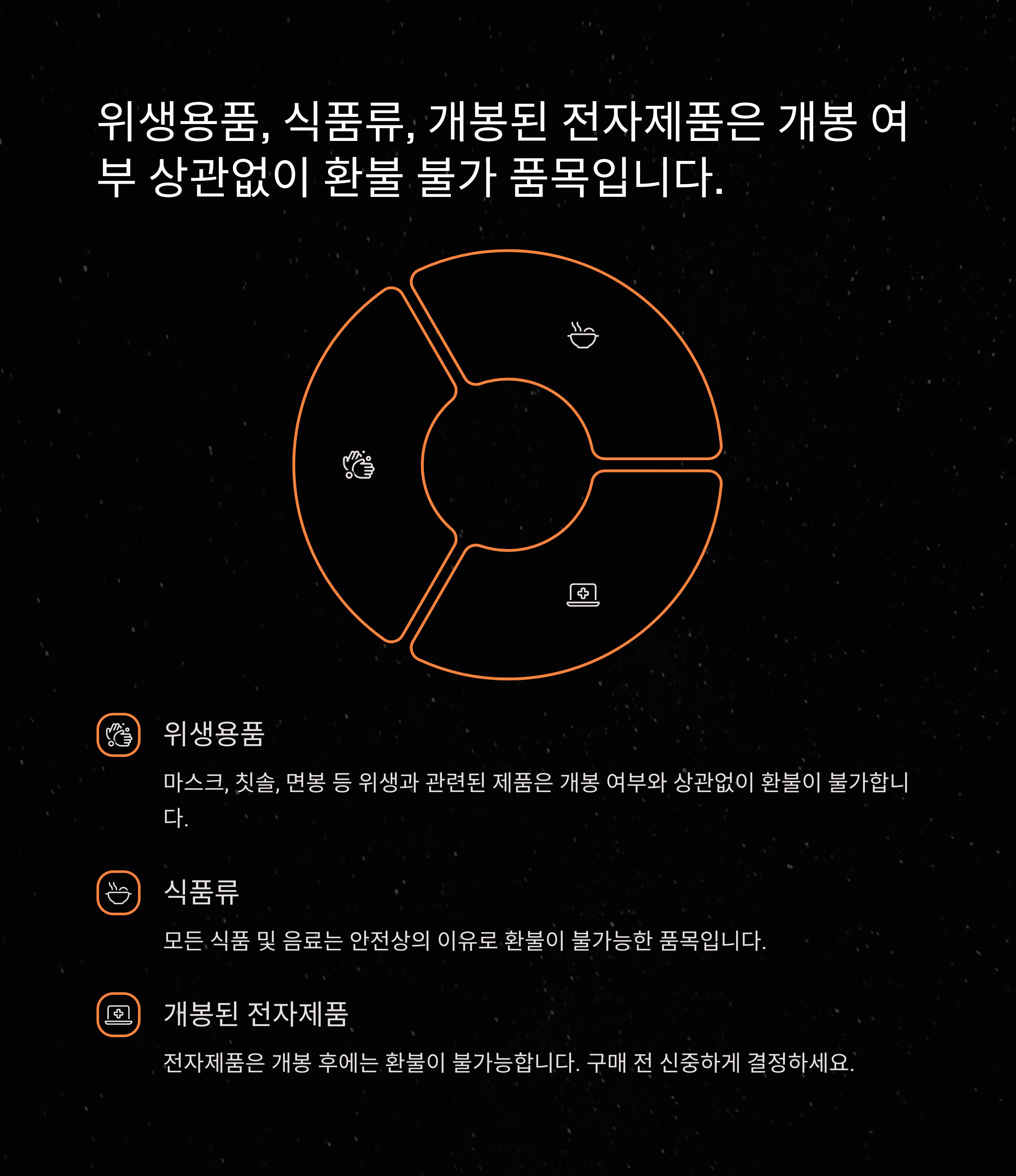 | 환불 불가 품목 | 위생용품, 식품, 개봉상품 |