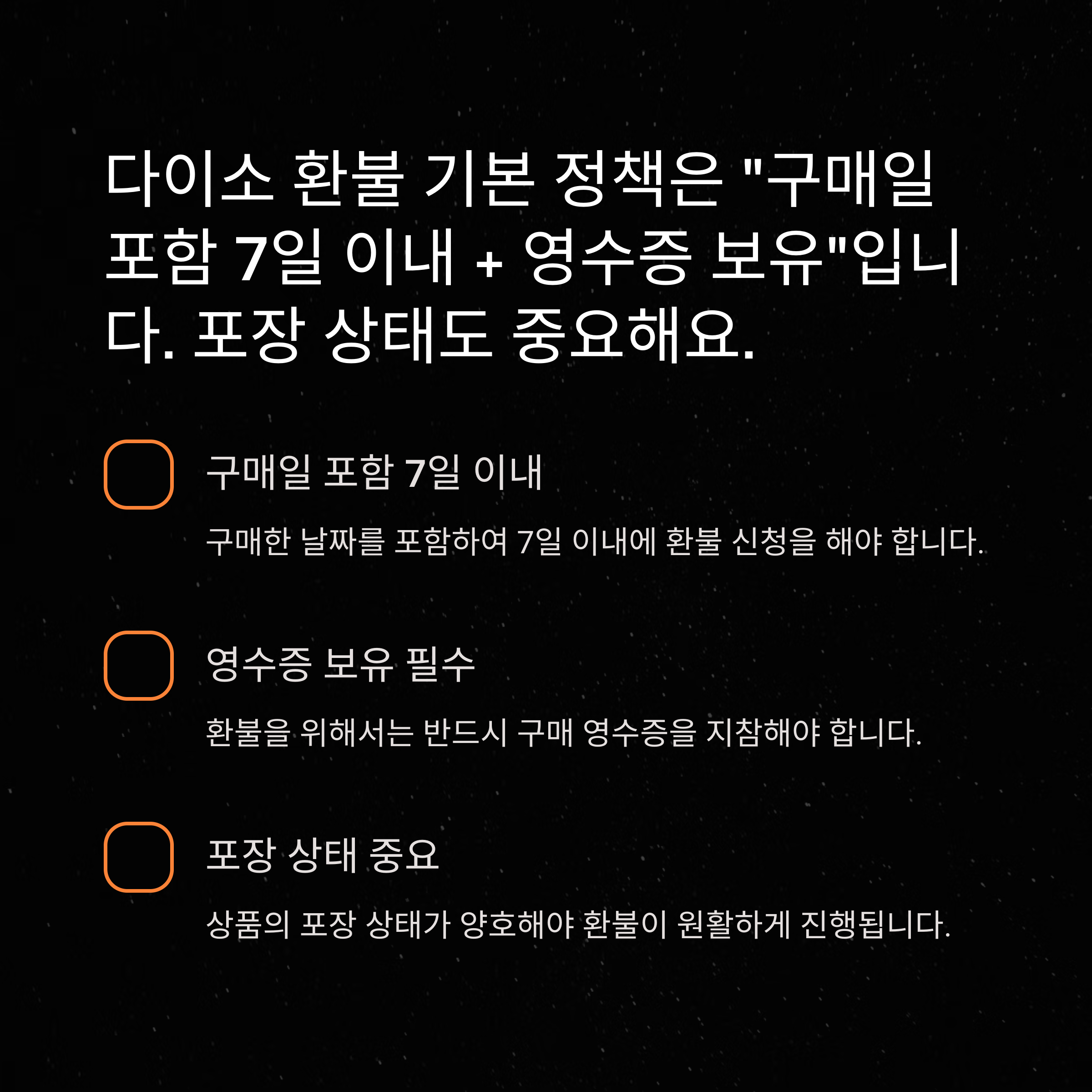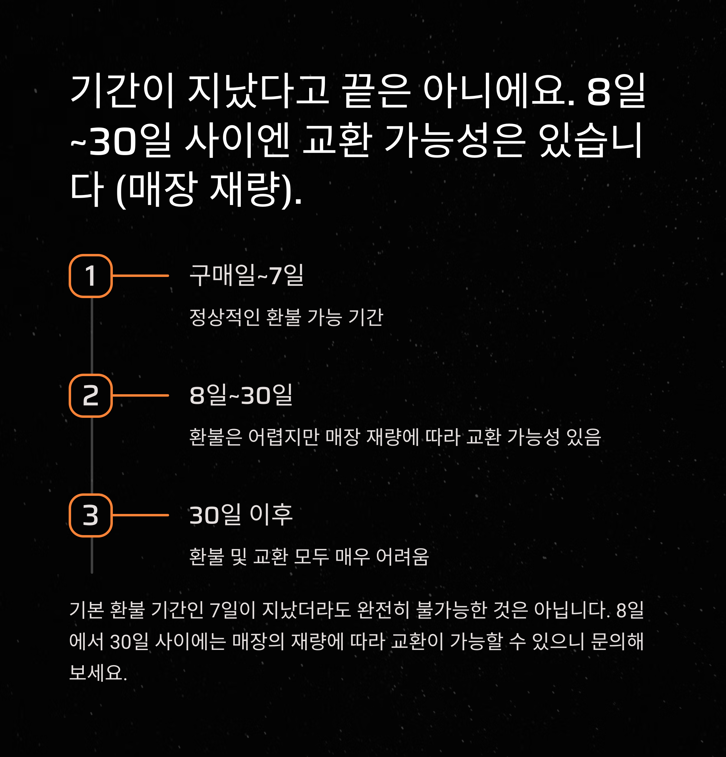 - 영수증이 있다면 7일 이내 무조건 환불 가능 (포장, 상품 상태 양호 기준)
