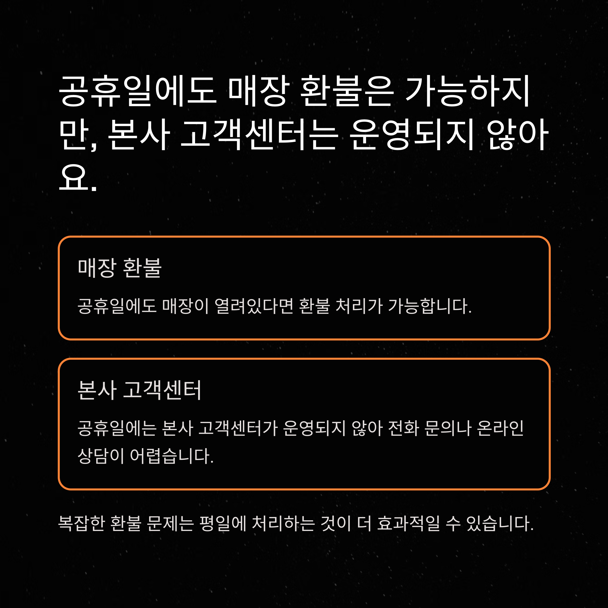다만, 공휴일에는 본사 고객센터가 운영되지 않기 때문에, 환불 관련 문제 발생 시 매장 직접 문의가 유일한 수단이라는 점 참고해주세요.