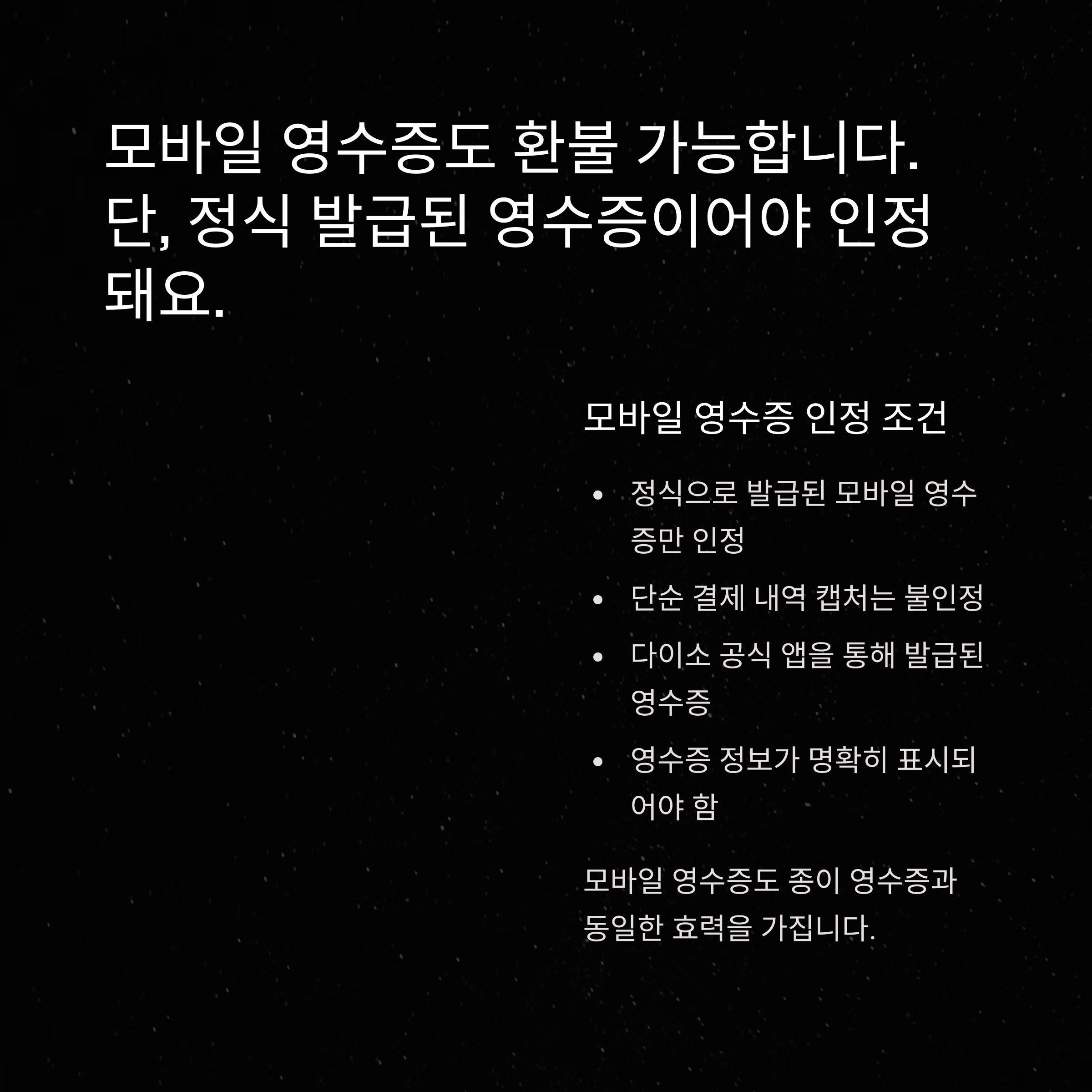 다이소에서는 카드 전표나 포인트 내역도 환불 근거로 인정하지 않기 때문에, 반드시 영수증을 잘 보관하셔야 합니다.