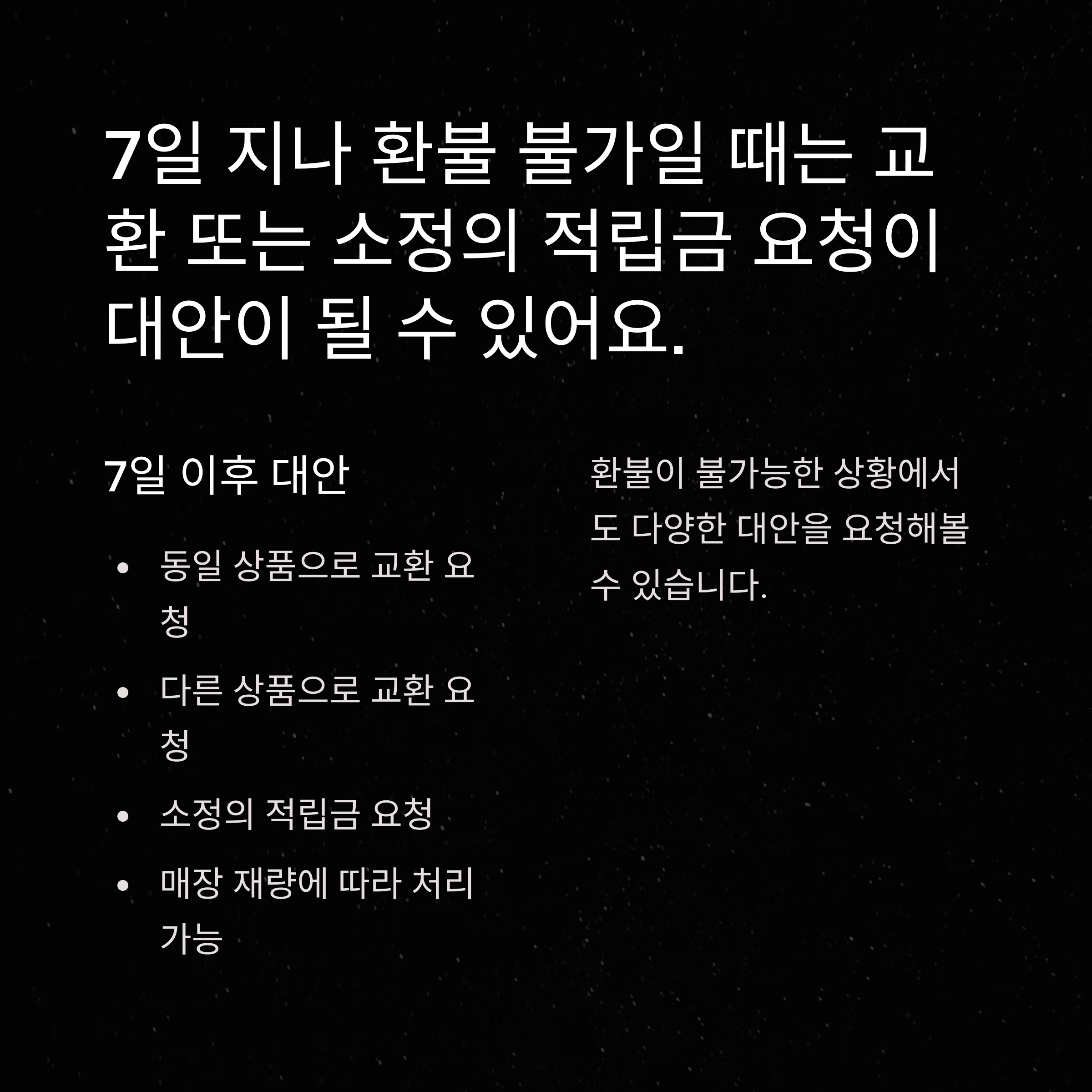7일이 지나 환불이 곤란할 때는, 제가 매장 직원분께 요청하여 동일 상품 교환 또는 소정의 적립금 발급을 받았던 경험이 있습니다. 다음 절차를 따르면 도움이 될 수 있습니다: