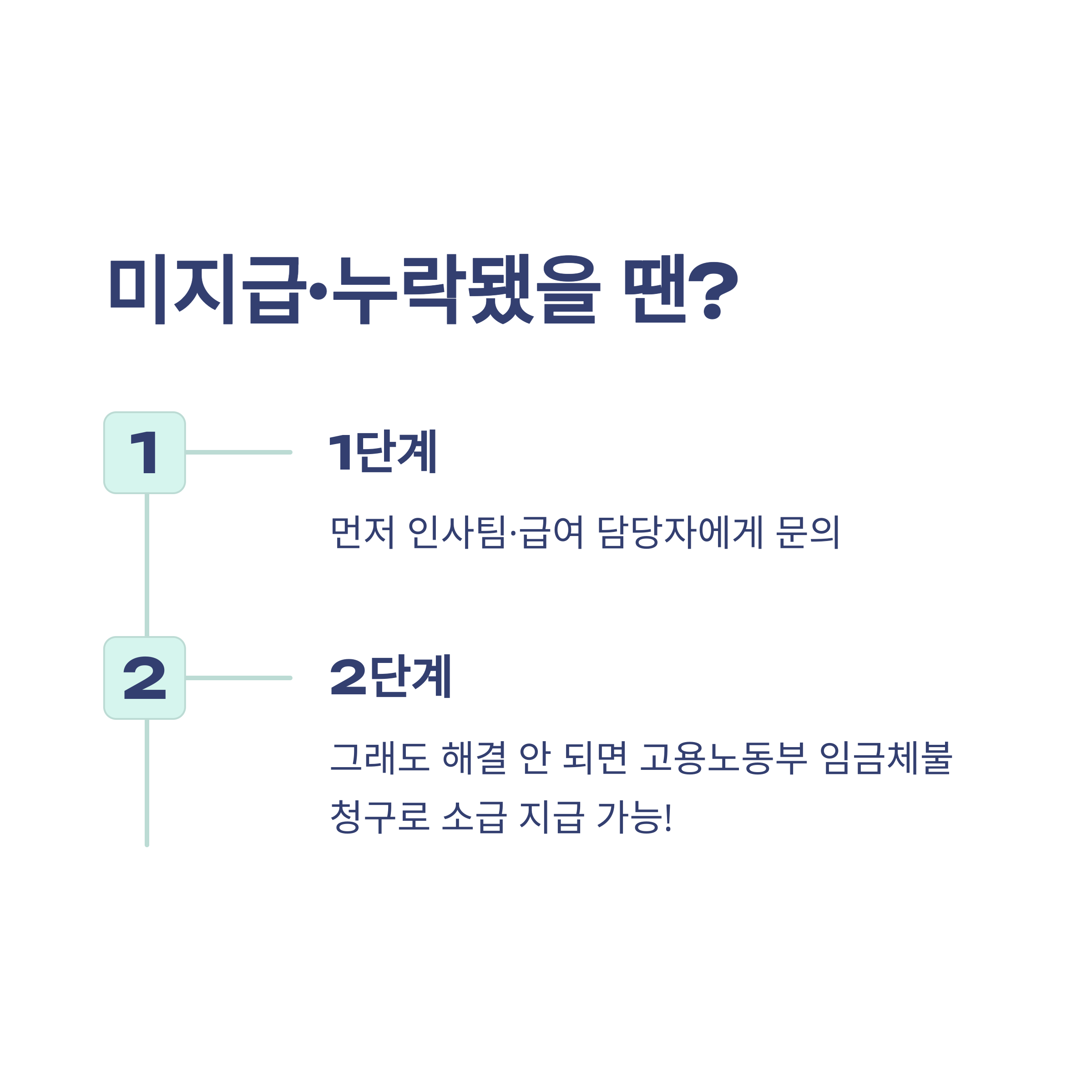 | 미지급 대처 | 사내 문의→노동부 신고 | 임금체불 청구 가능 |