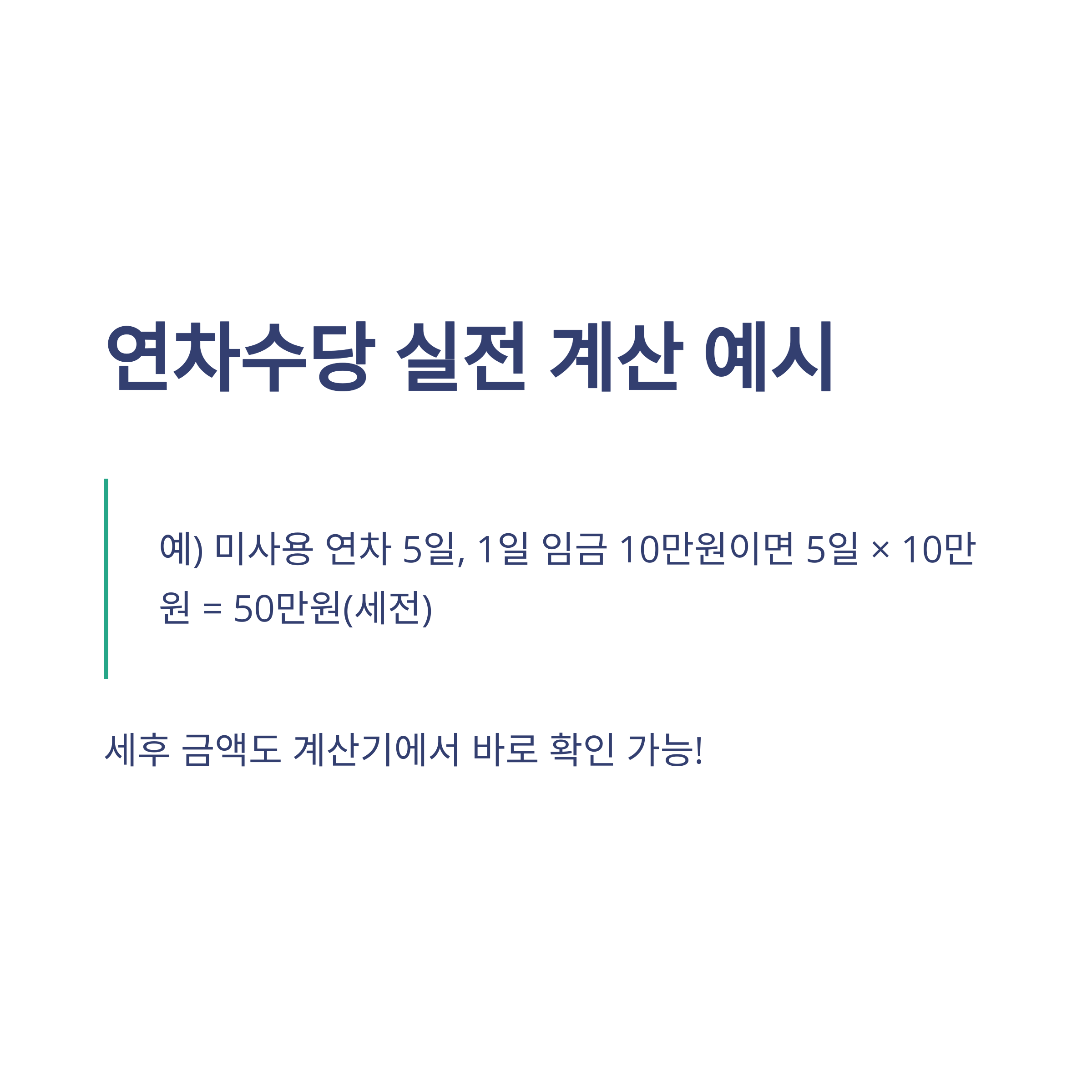 | 총 수당 | 미사용일수 × 1일 통상임금 | 5 × 100,000 = 500,000원 |