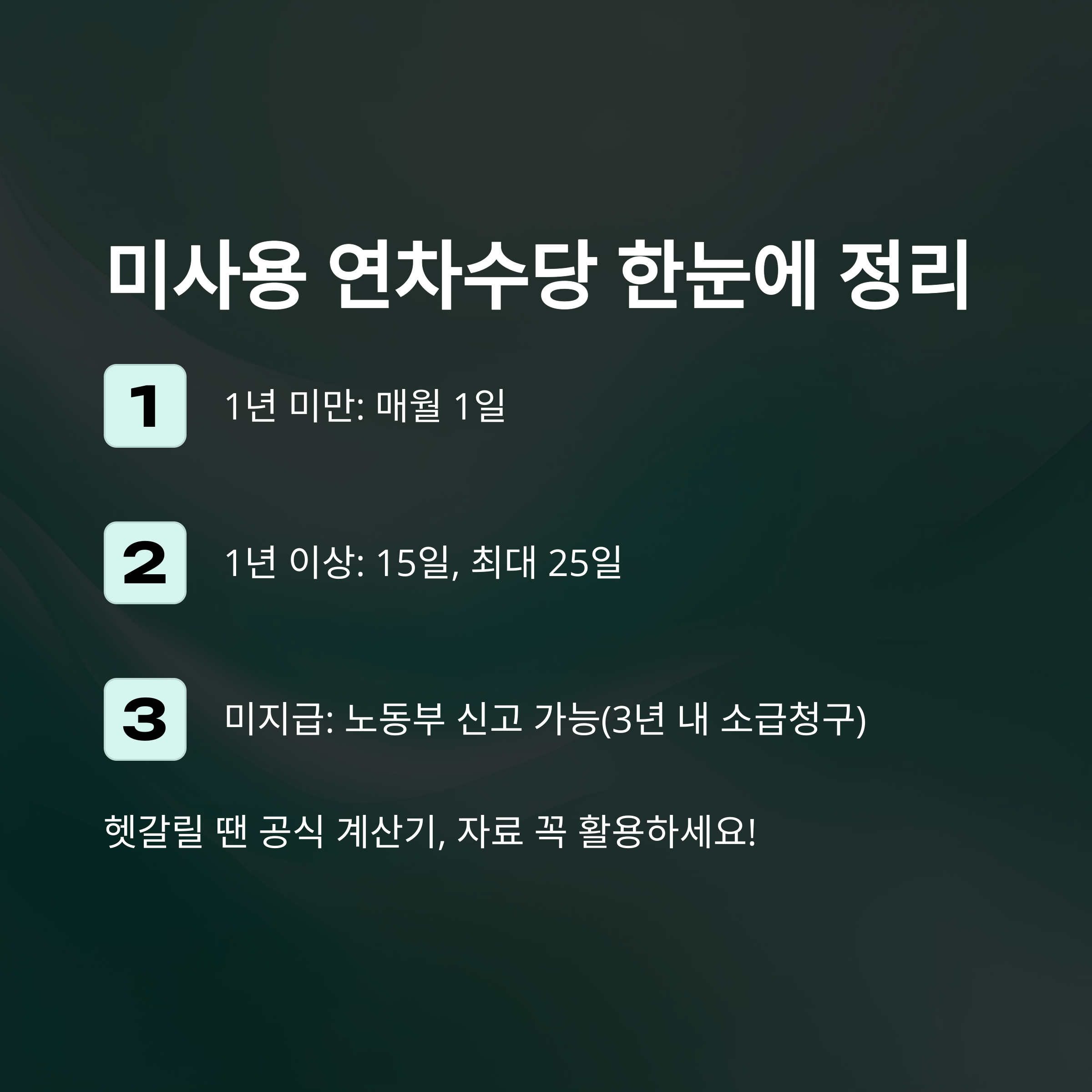 미사용 연차수당은 회사마다 지급 방식이 달라 헷갈릴 수 있으니, 핵심표로 꼭 체크하고 공신력 있는 계산기와 공식 자료를 항상 참고하세요.