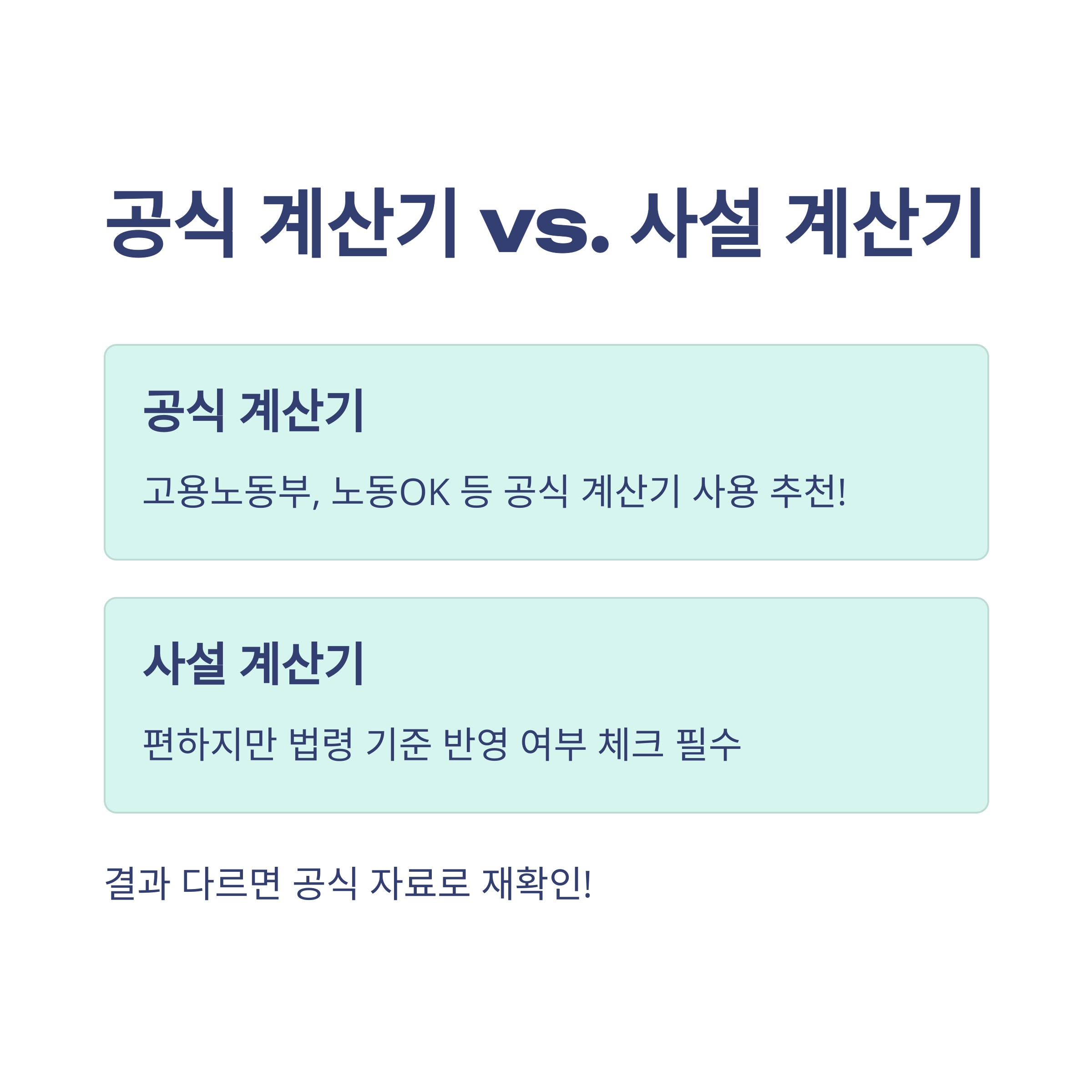 - 고용노동부, 노동OK, 근로복지공단 등 공식 계산기 사용 권장