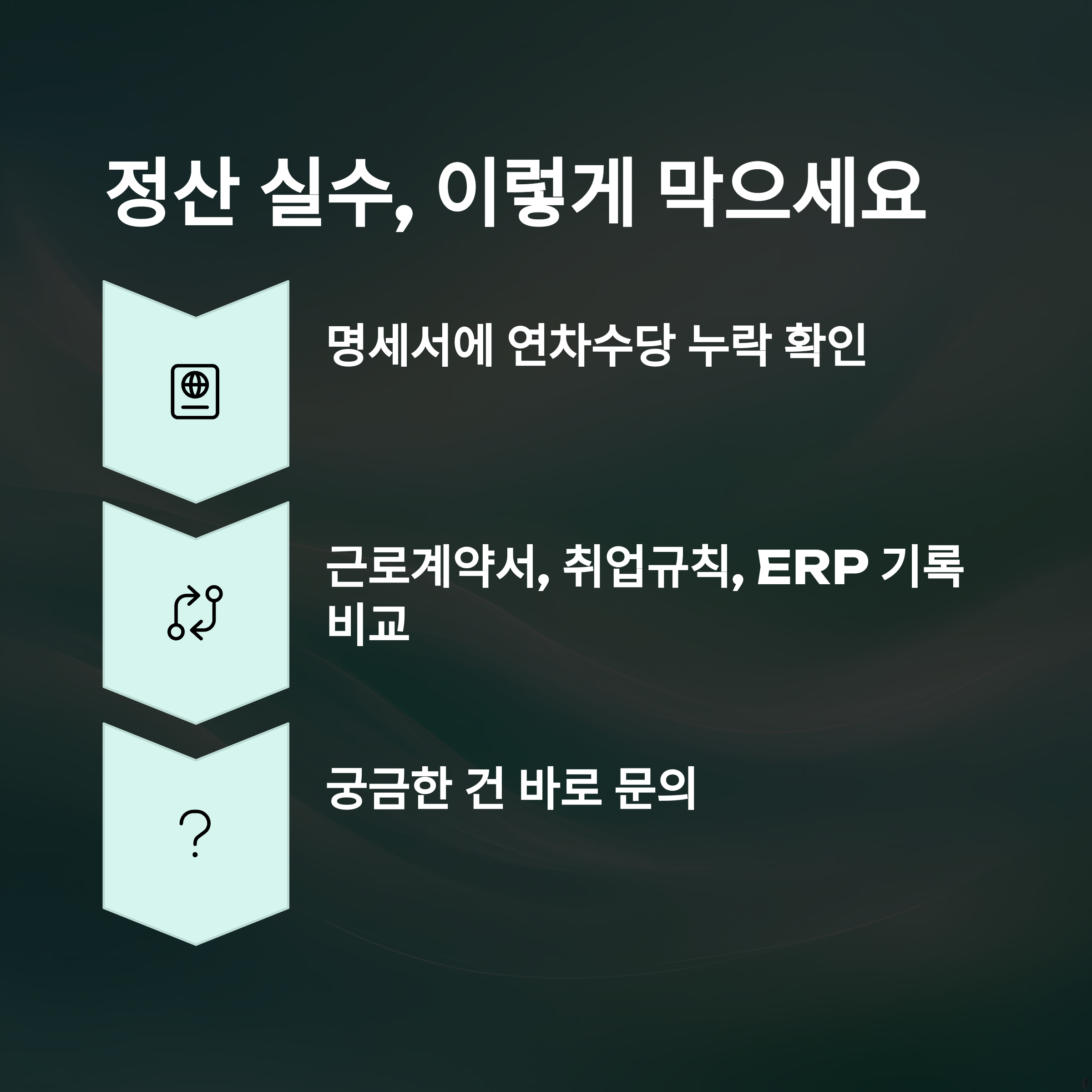 - 명세서에 연차수당이 안 나올 때는 반드시 담당자에게 문의