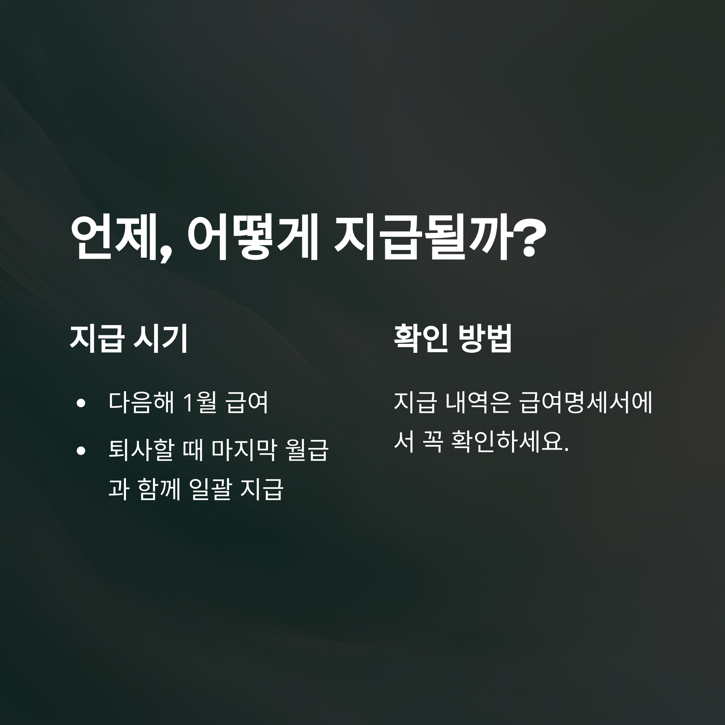 | 지급 시기 | 다음해 1월 또는 퇴직시 | 급여명세서 확인 |