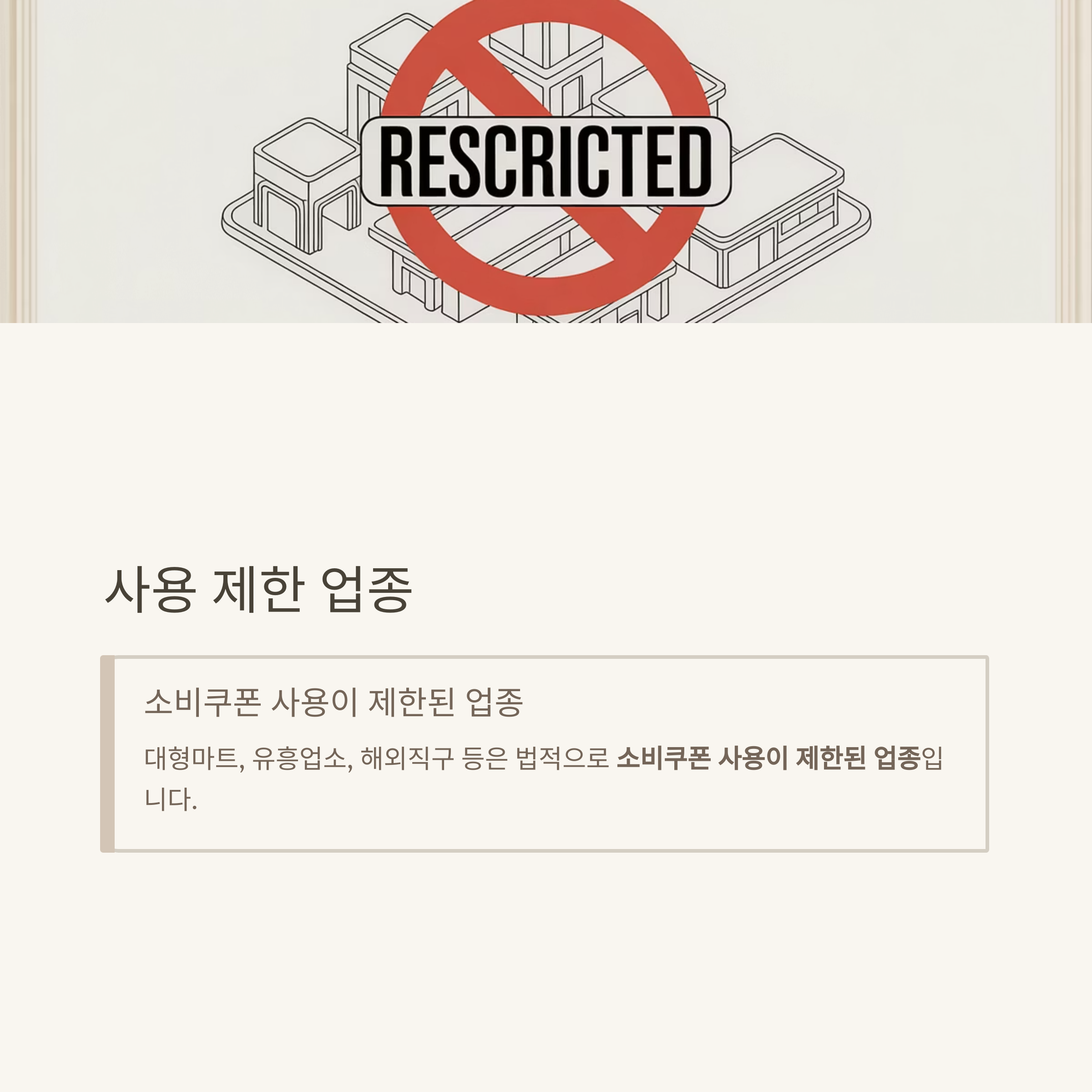 사용 불가 업종은 법적으로 명시되어 있으며, 아래와 같은 업종에서는 소비쿠폰을 사용할 수 없습니다.
