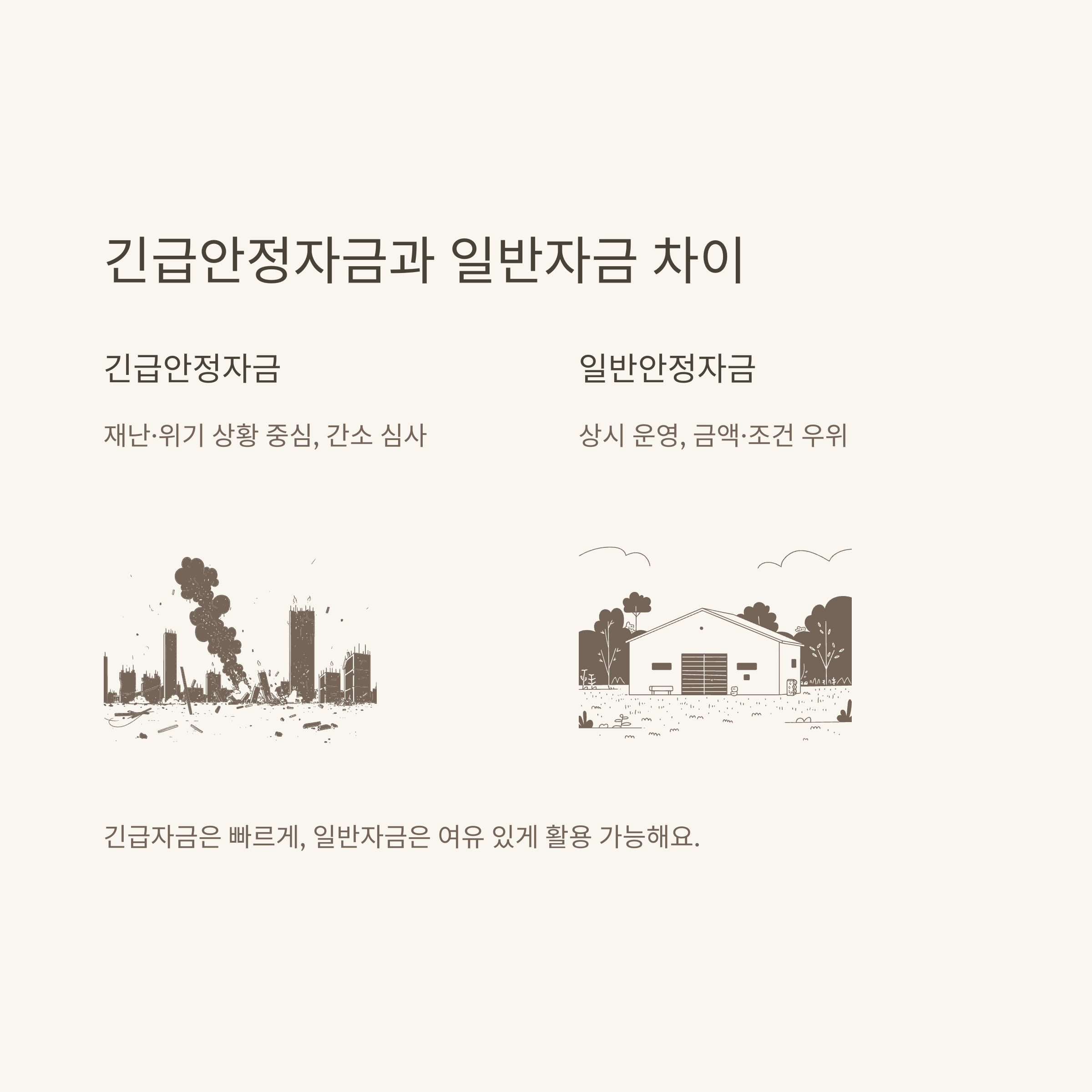 긴급자금은 위기 대응 중심이라 빠르게 나오지만, 장기적으로 보면 일반자금이 이자 혜택이나 한도에서 더 유리했어요.