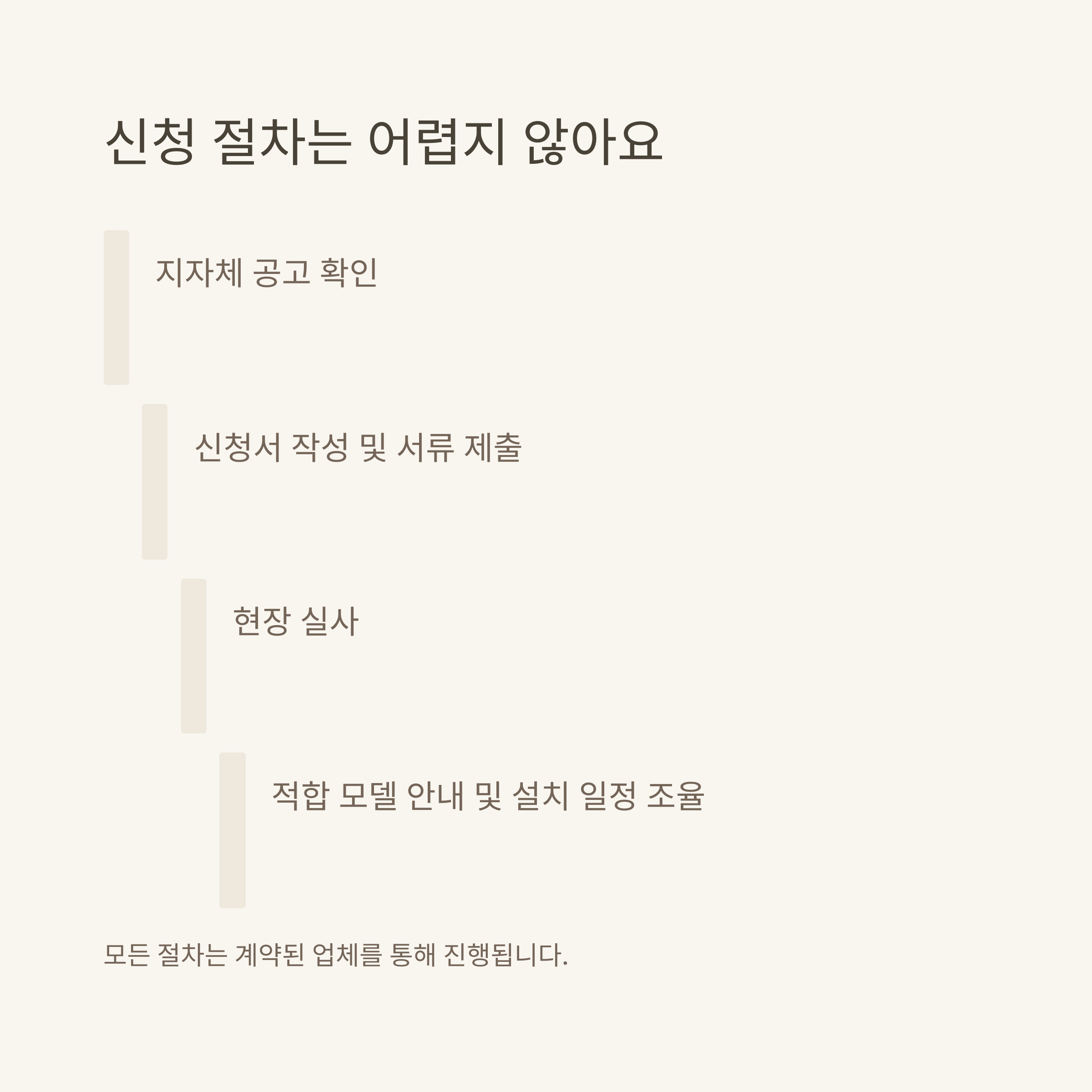 저는 6월 초에 신청해서 6월 말에 설치까지 완료됐어요. 처음엔 지원금이 언제 들어오나 걱정했지만, 모든 절차가 계약업체를 통해 진행되기 때문에 사비를 먼저 쓰지 않아도 됐습니다. 제가 겪은 순서 정리: