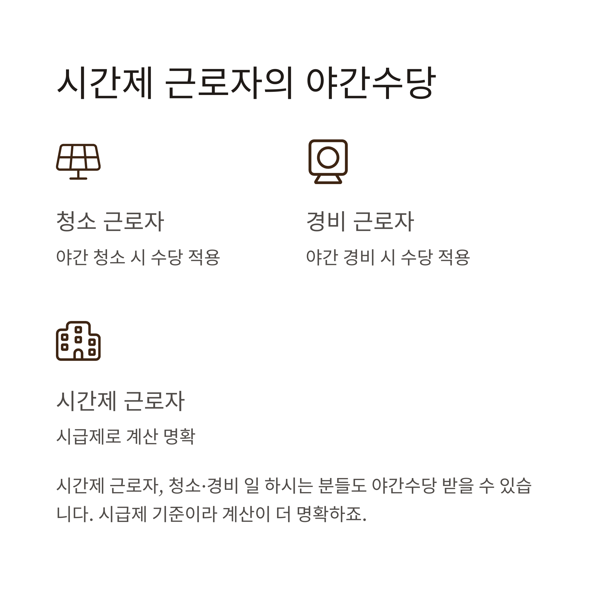 시간제로 일하시는 분들도 야간 근무를 하시는 경우가 많죠. 저희 부모님도 청소 용역으로 새벽근무를 하시는데, 시간제 근로자도 야간수당을 동일하게 받을 수 있습니다.