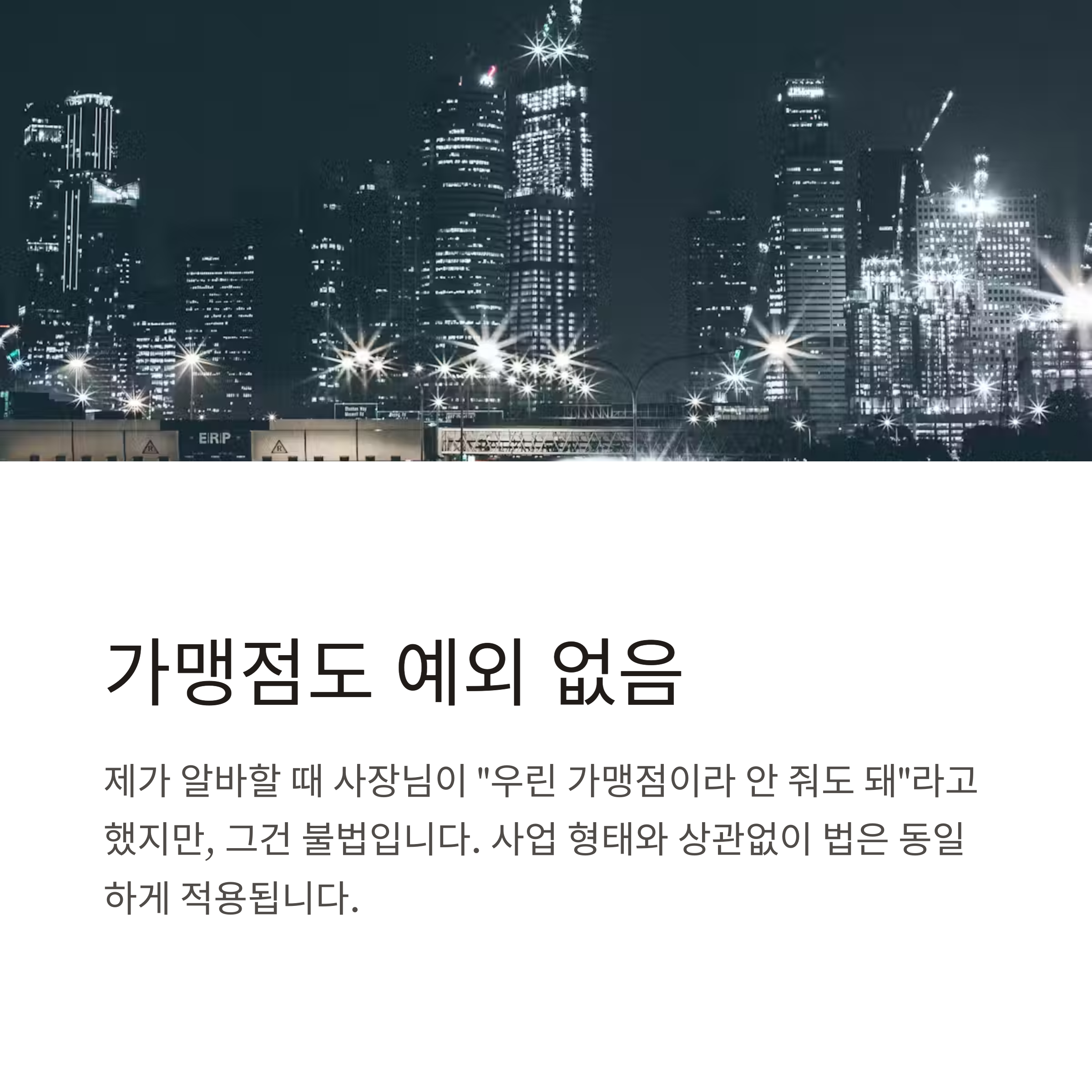 이건 정규직, 계약직, 알바를 가리지 않고 모든 근로자에게 적용되며, 심지어 수습 기간이라 하더라도 예외가 아닙니다. 제가 일했던 편의점도 본사 직영이 아니라 가맹점이었지만, 법 기준을 따르지 않으면 신고 대상이 된다고 들었어요.