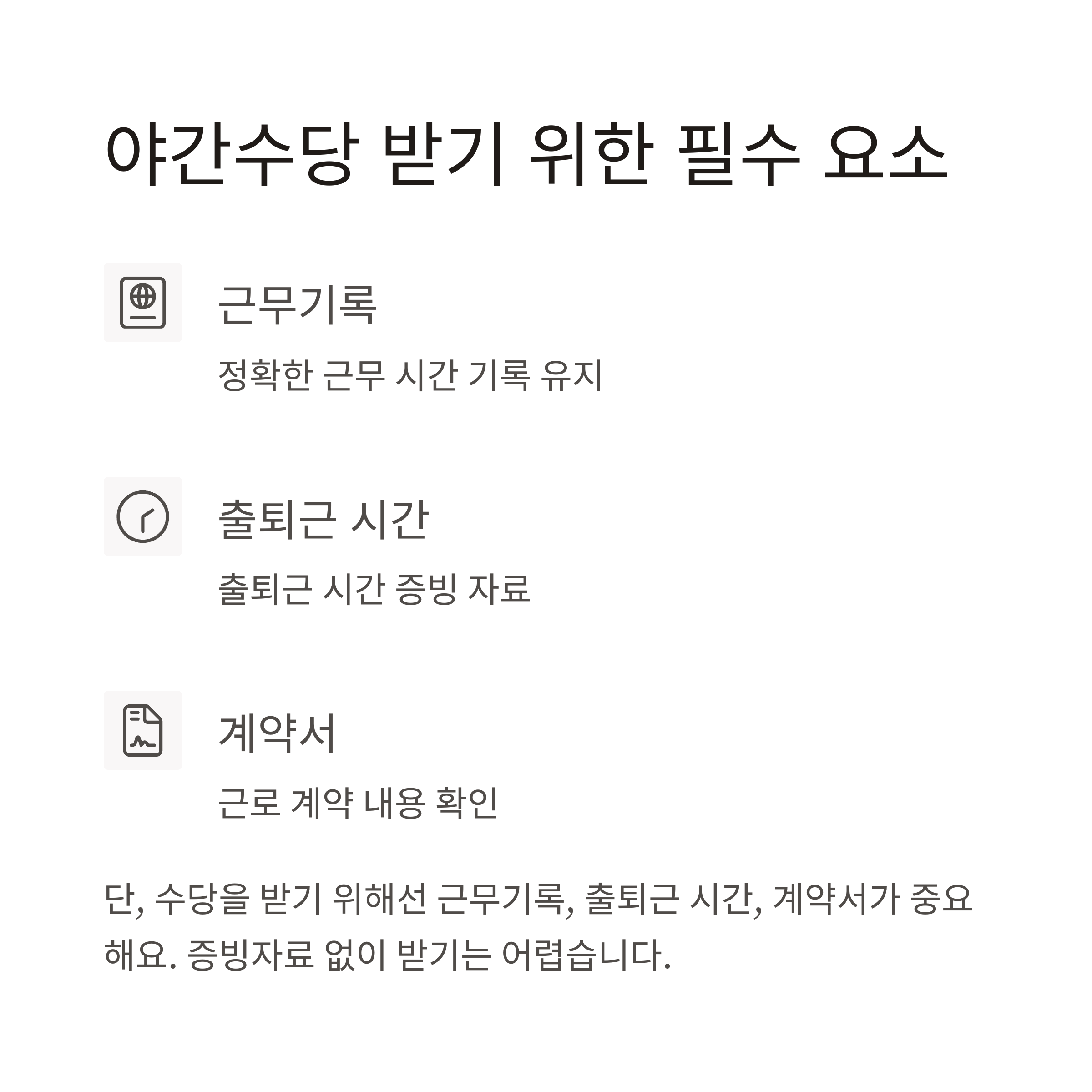 주의할 점은 **단순히 “야간에 일했다”는 이유만으로 수당이 무조건 나오는 게 아니라**, 근로계약서, 출근기록, 근무일지 등 증빙자료가 필요하다는 점이에요. 저도 이전에 알바했던 가게에서 야간수당을 못 받은 적이 있었는데, 근무기록이 없어 신고도 어렵더라고요.
