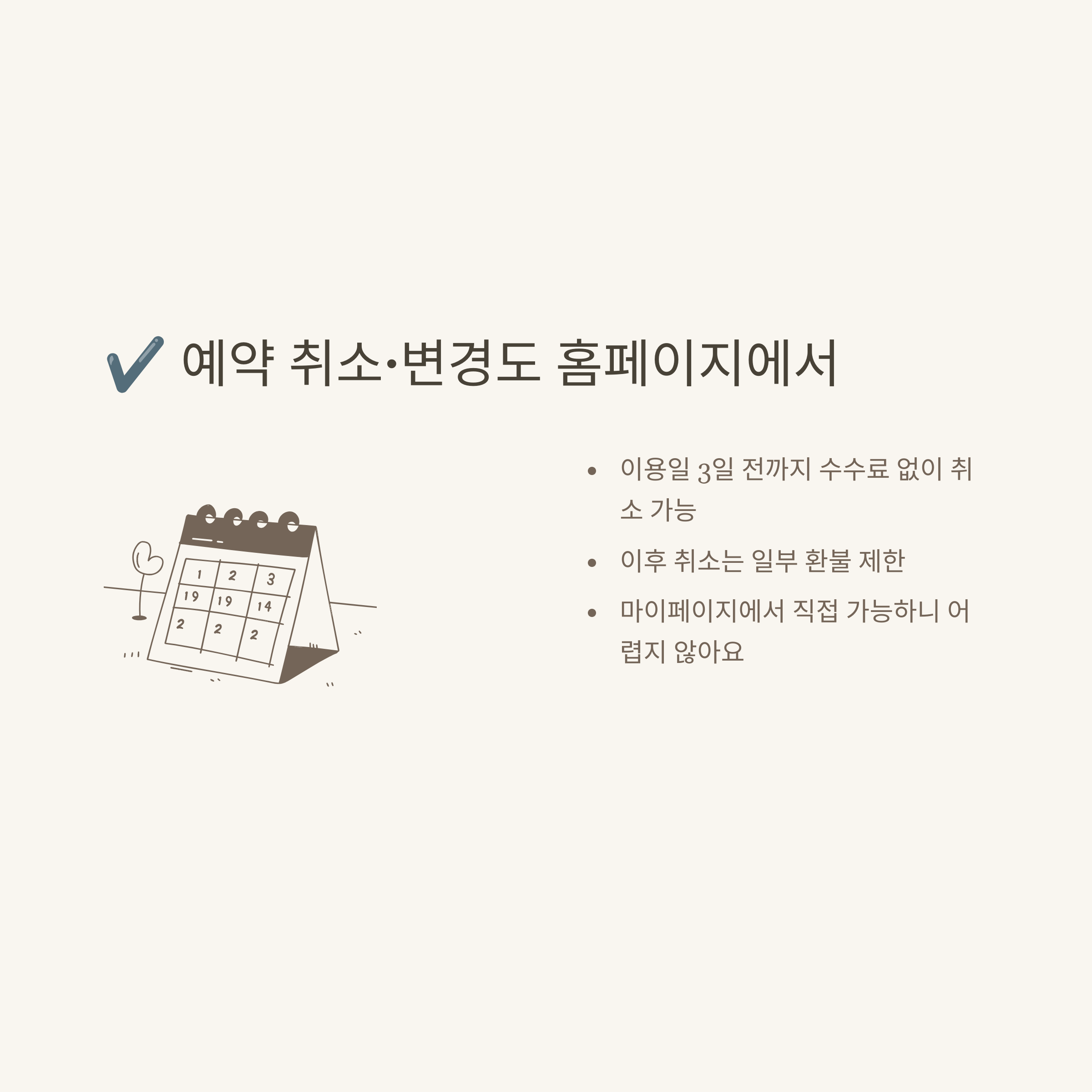 예약 취소/변경 | 마이페이지 직접 취소, 환불 규정 숙지 | 자세히 |