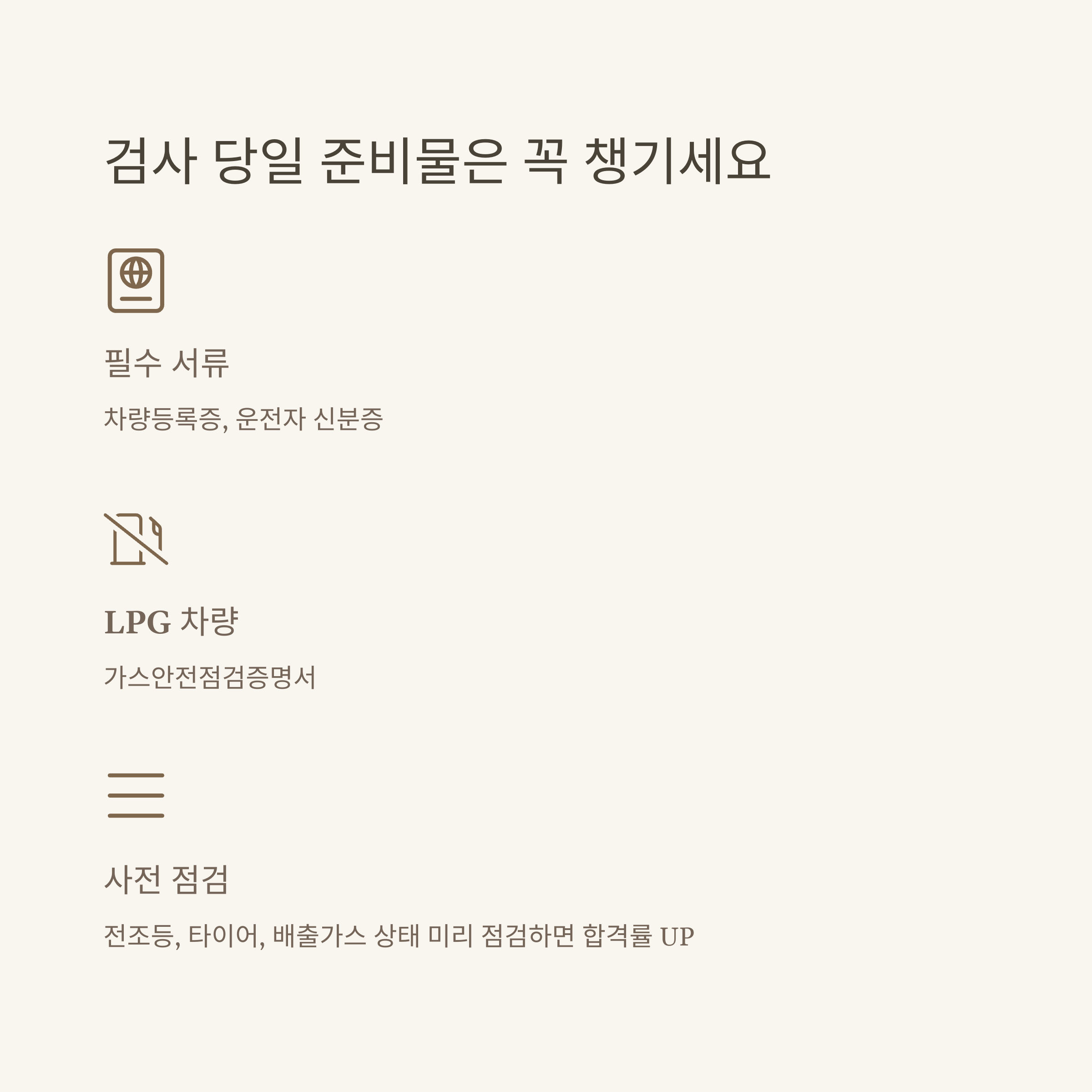 - 차량등록증, 운전자 신분증(필수), 검사비용 현금·카드