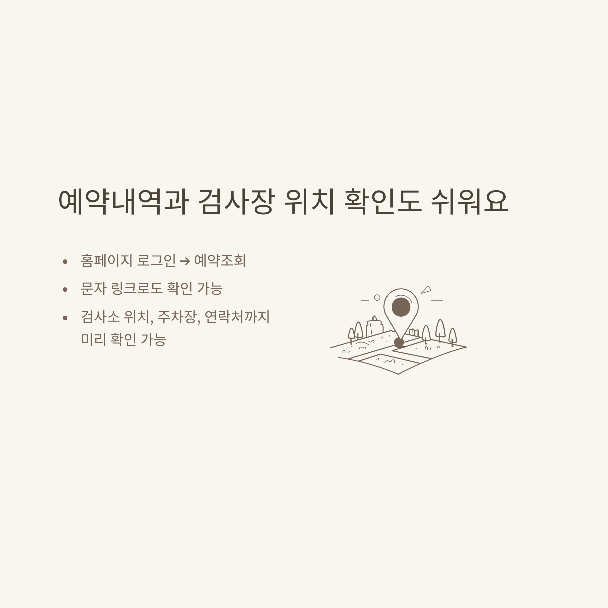 - 검사장 위치, 네비게이션 길찾기, 주차정보까지 미리 파악