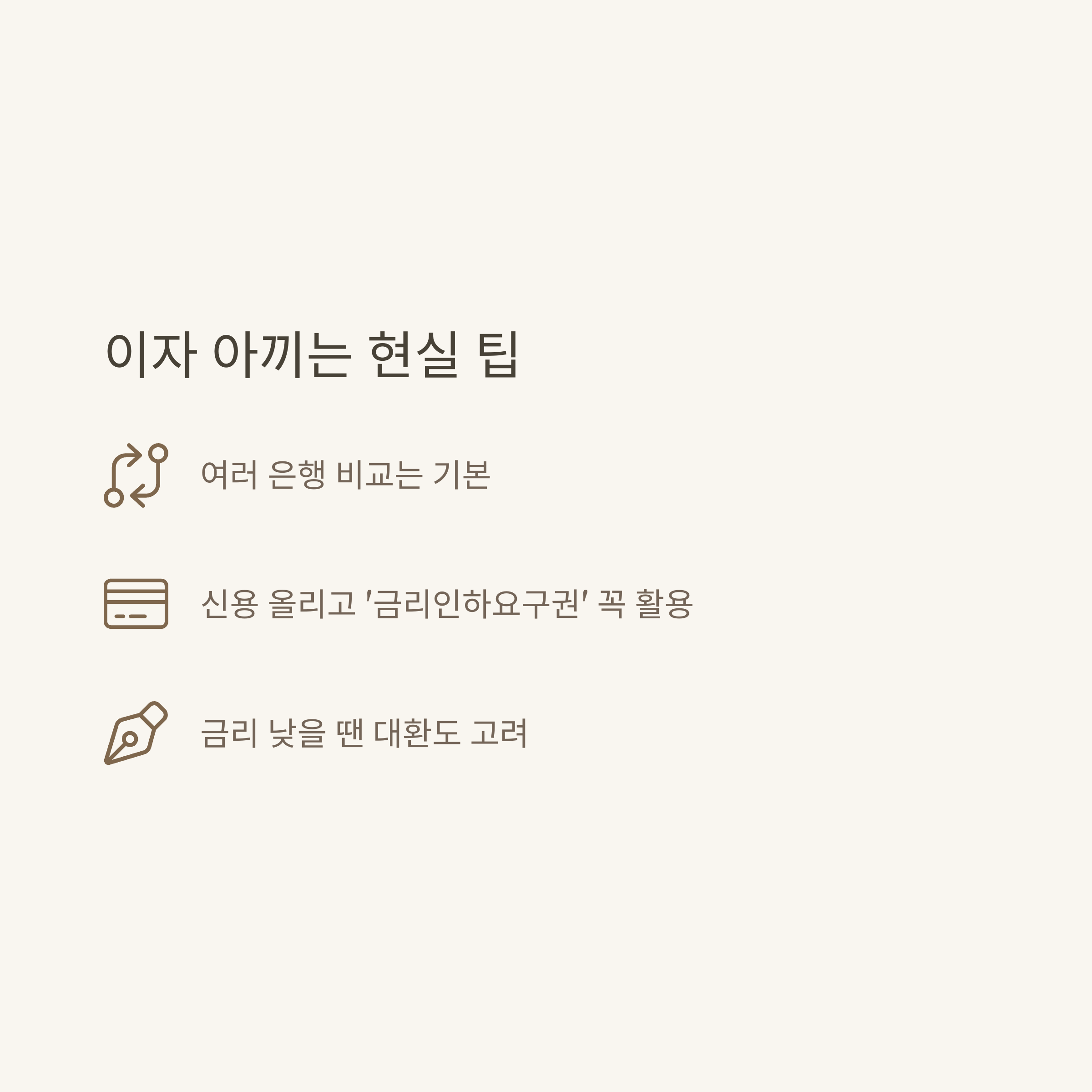 | 실무 팁 | 여러 은행 금리·한도 비교, 금리인하요구권 활용, 대환대출 적극 검토 |