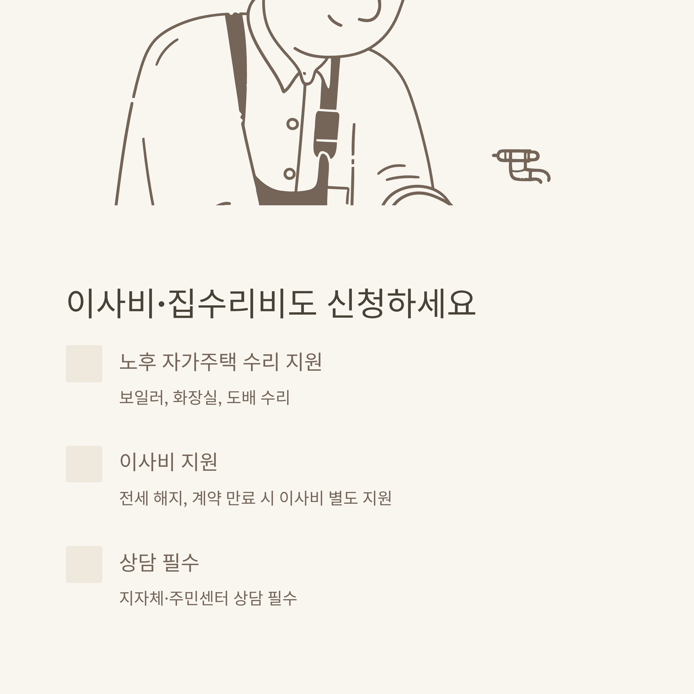 - 이사·집수리 사업은 지자체마다 내용이 다를 수 있으니 담당자 상담이 필수