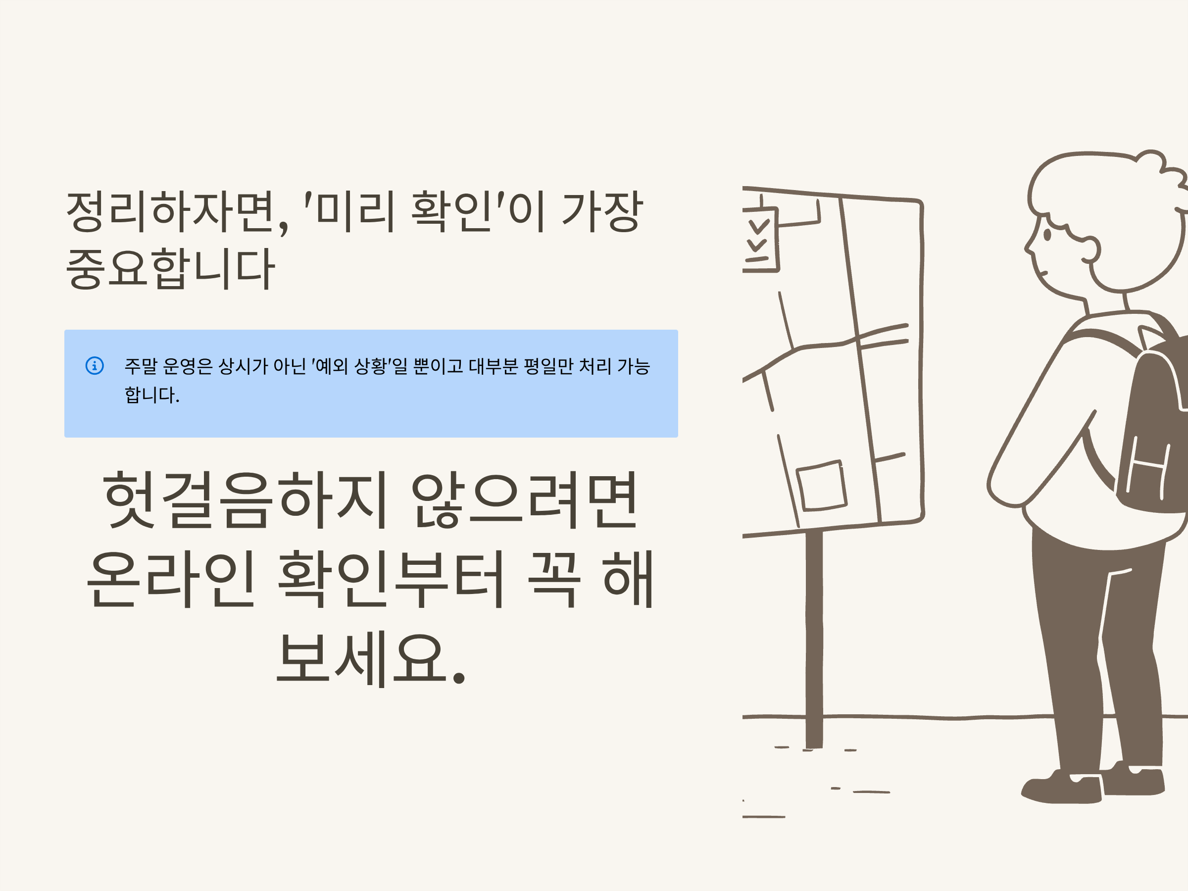 사전 전화 문의로 임시 운영 여부, 시간, 가능한 업무 반드시 확인